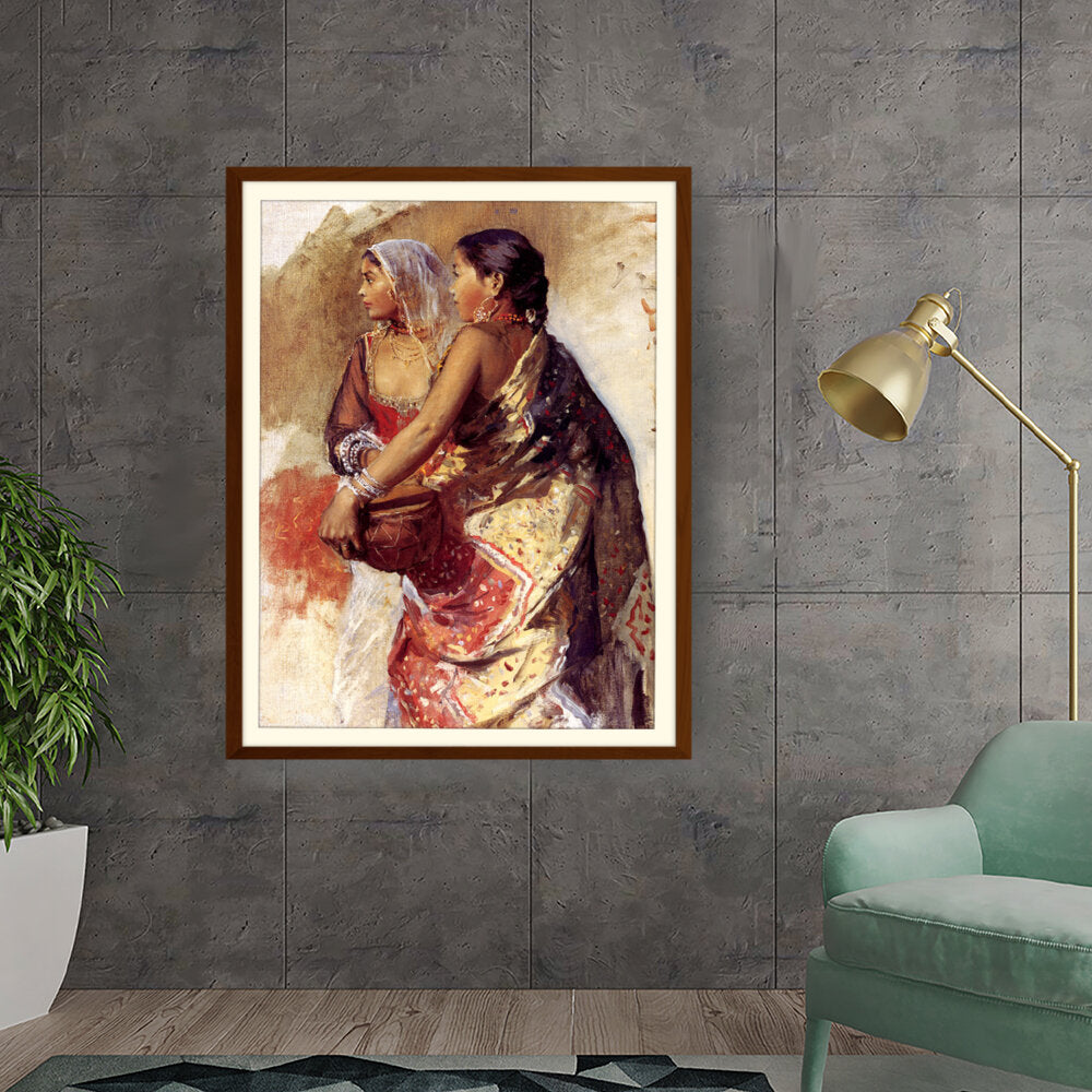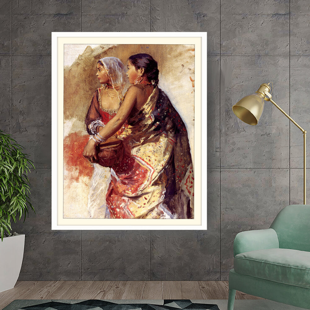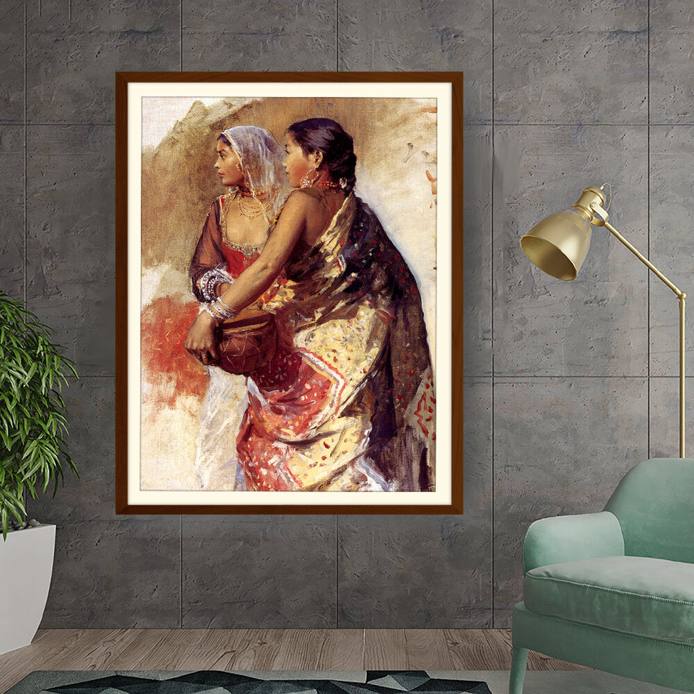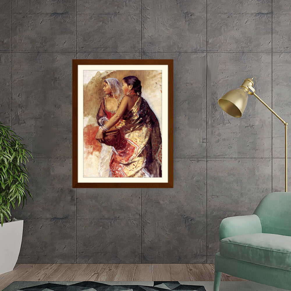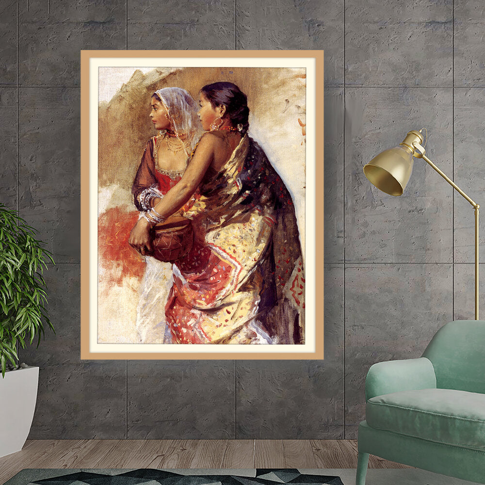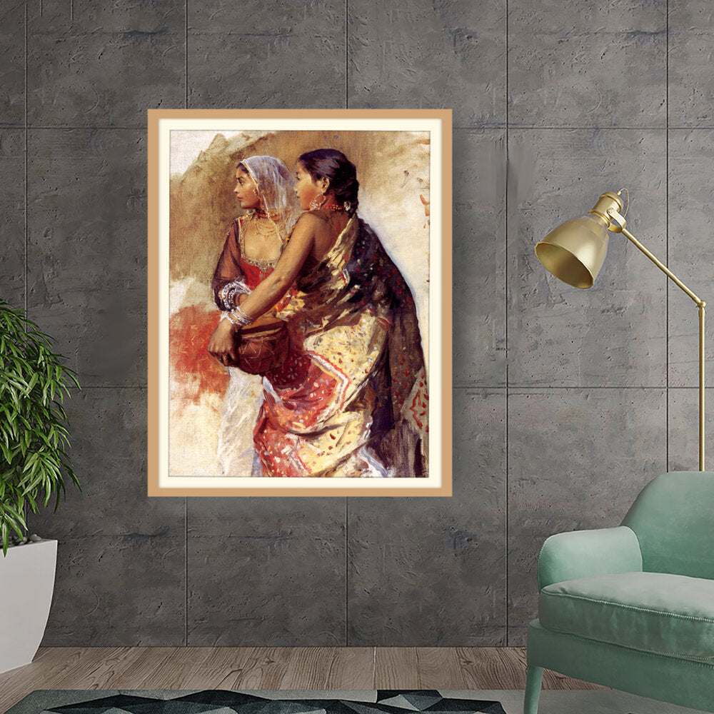 This exquisite oil painting captures two women adorned in traditional attire, showcasing intricate details and rich cultural elements. Their posture and expressions suggest a narrative, inviting viewers to explore the beauty of heritage and craftsmanship.