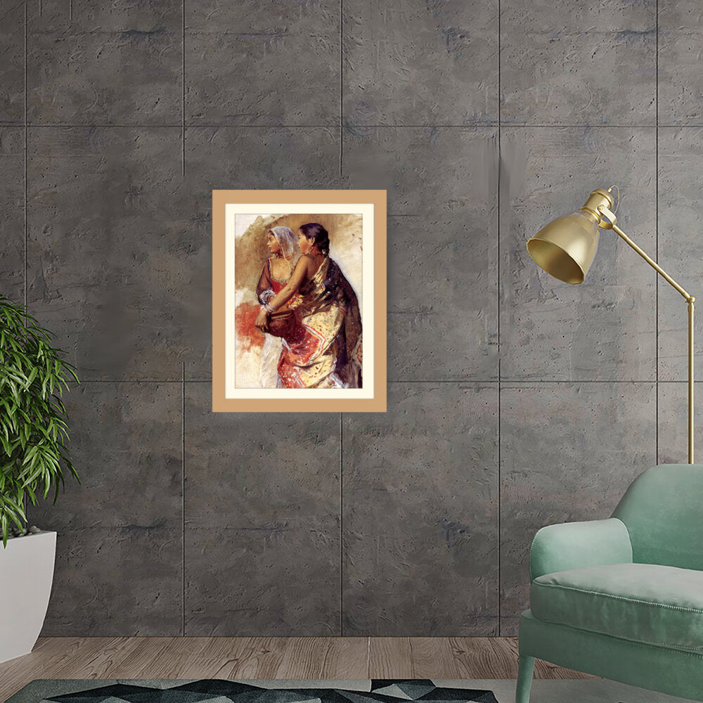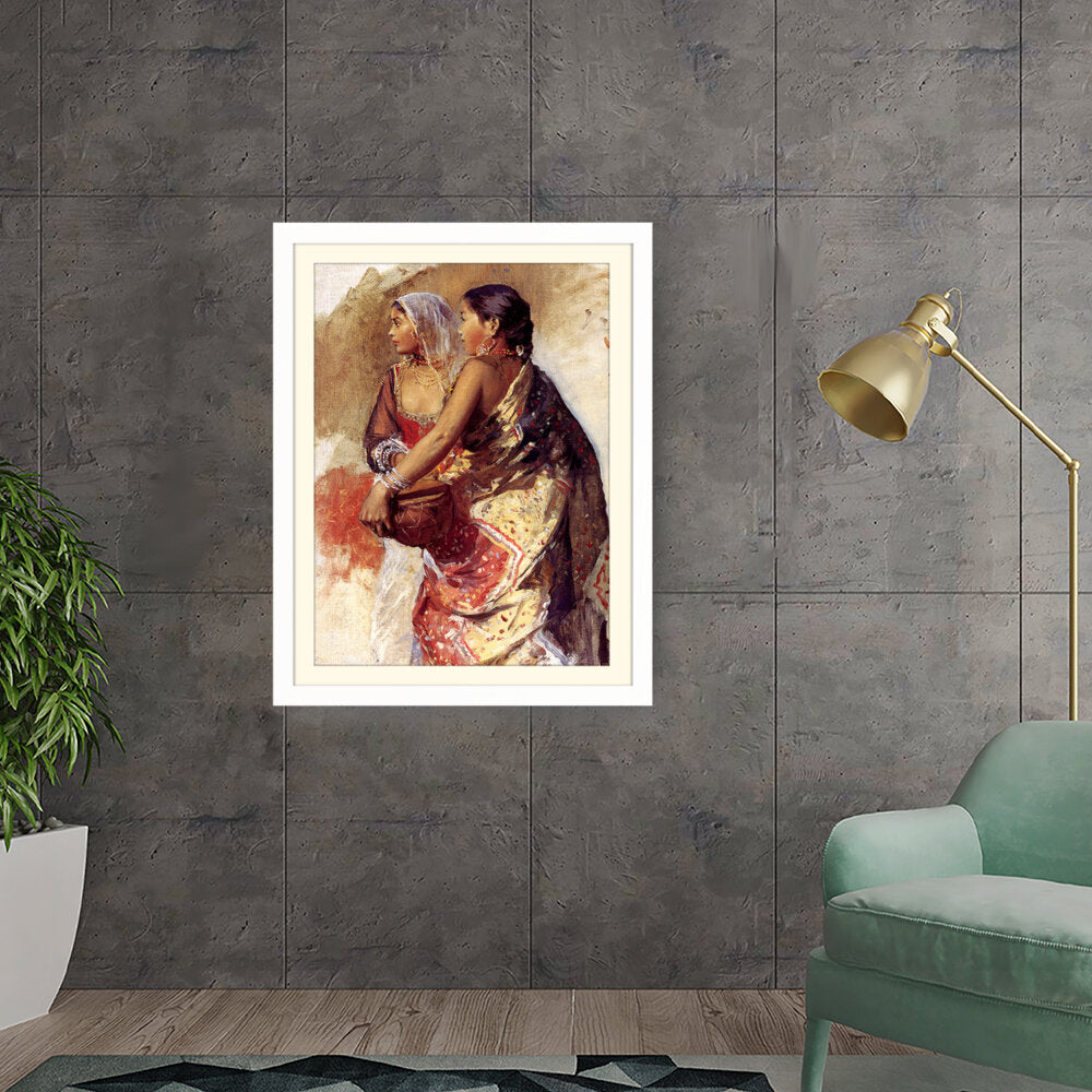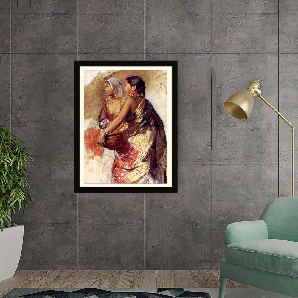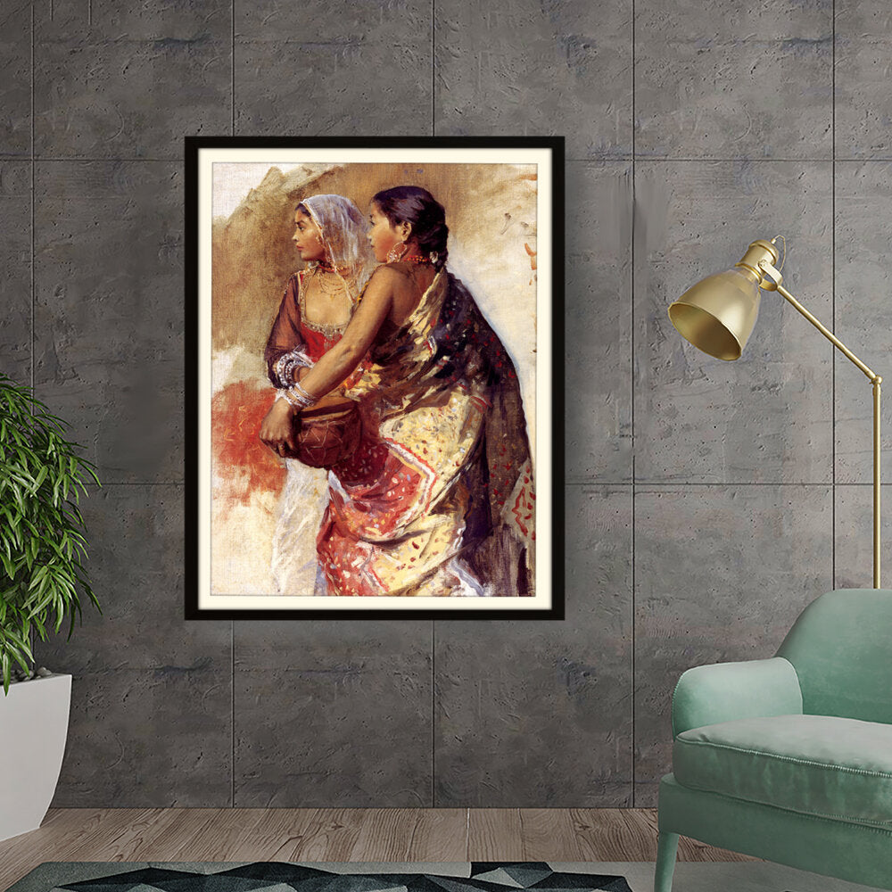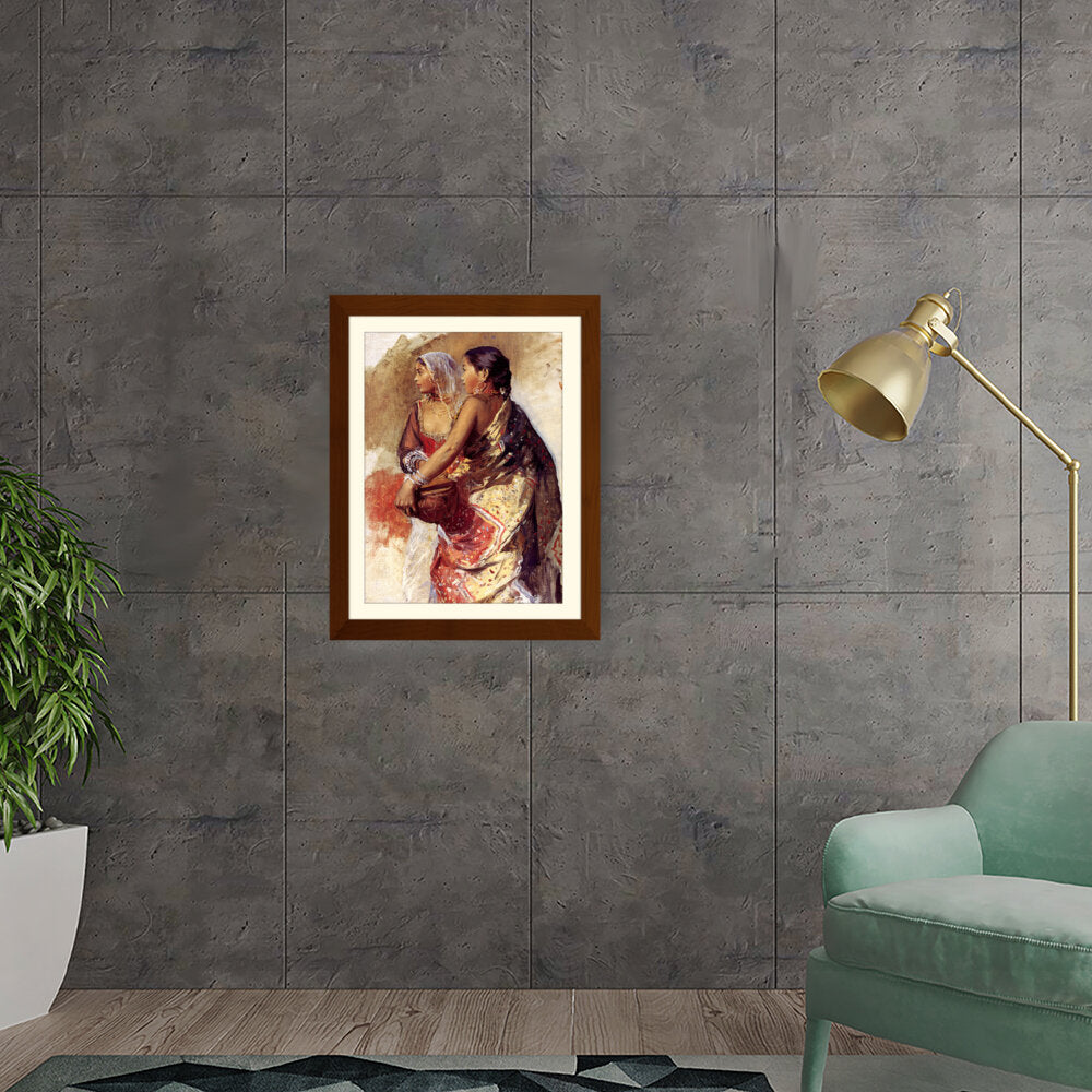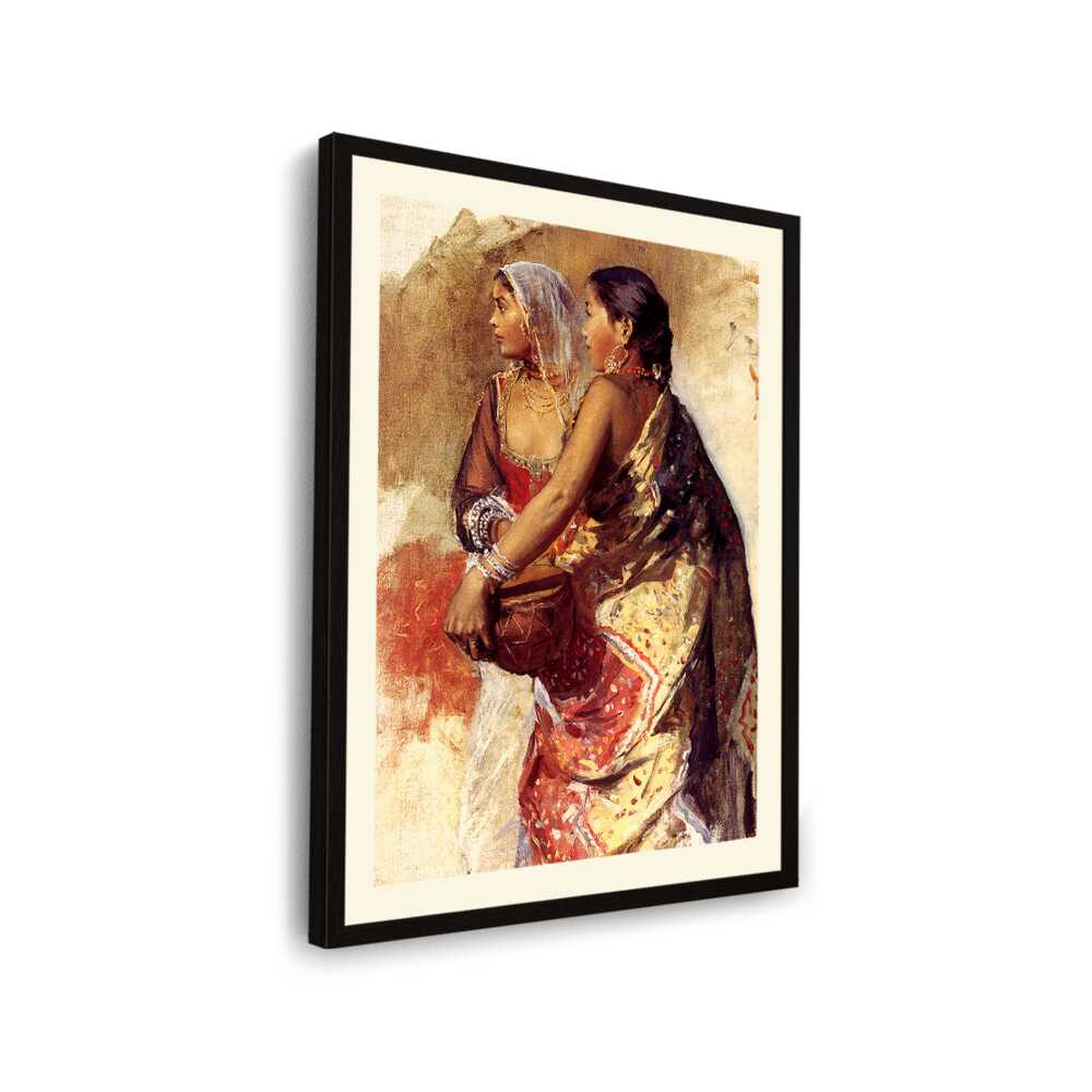 This exquisite oil painting captures two women adorned in traditional attire, showcasing intricate details and rich cultural elements. Their posture and expressions suggest a narrative, inviting viewers to explore the beauty of heritage and craftsmanship.