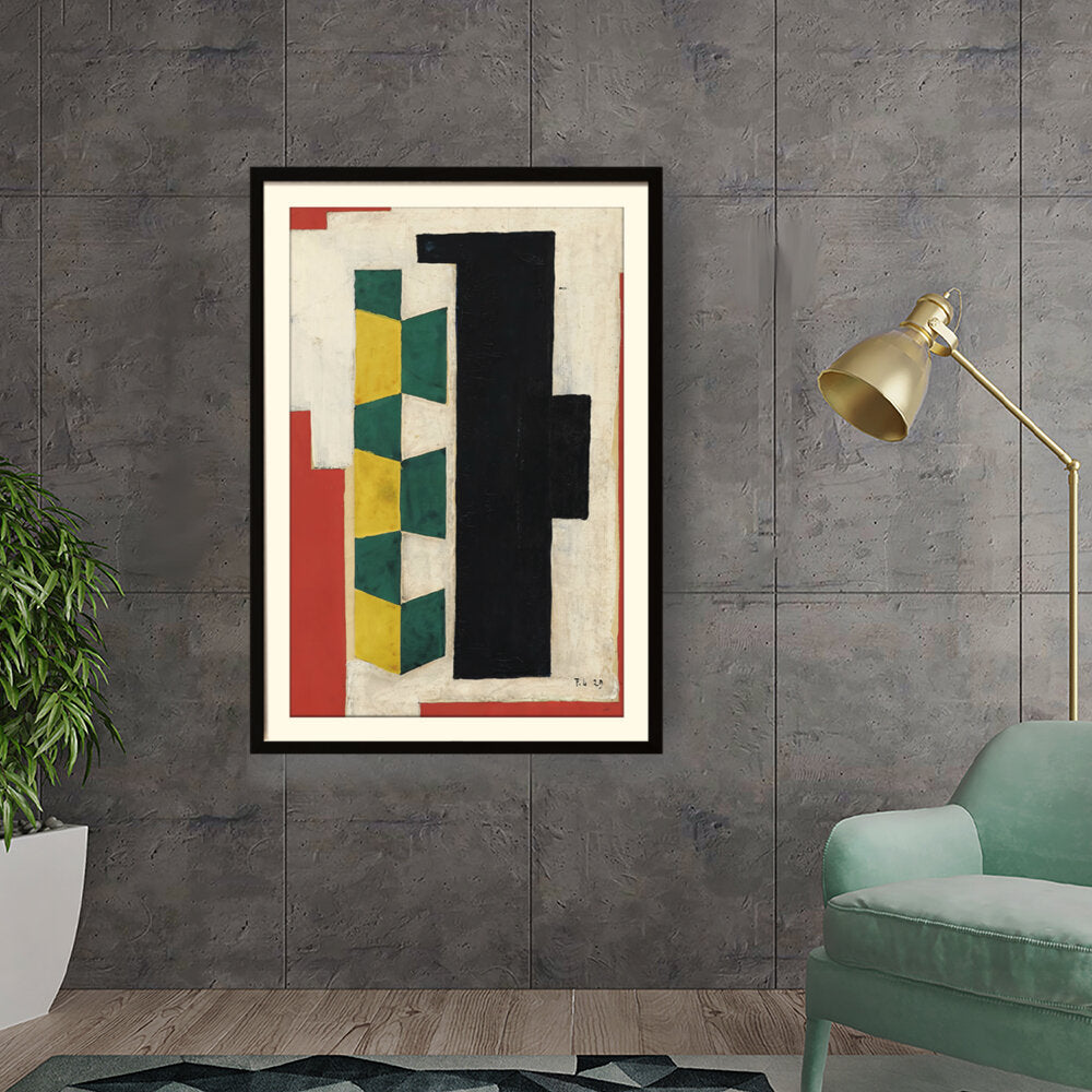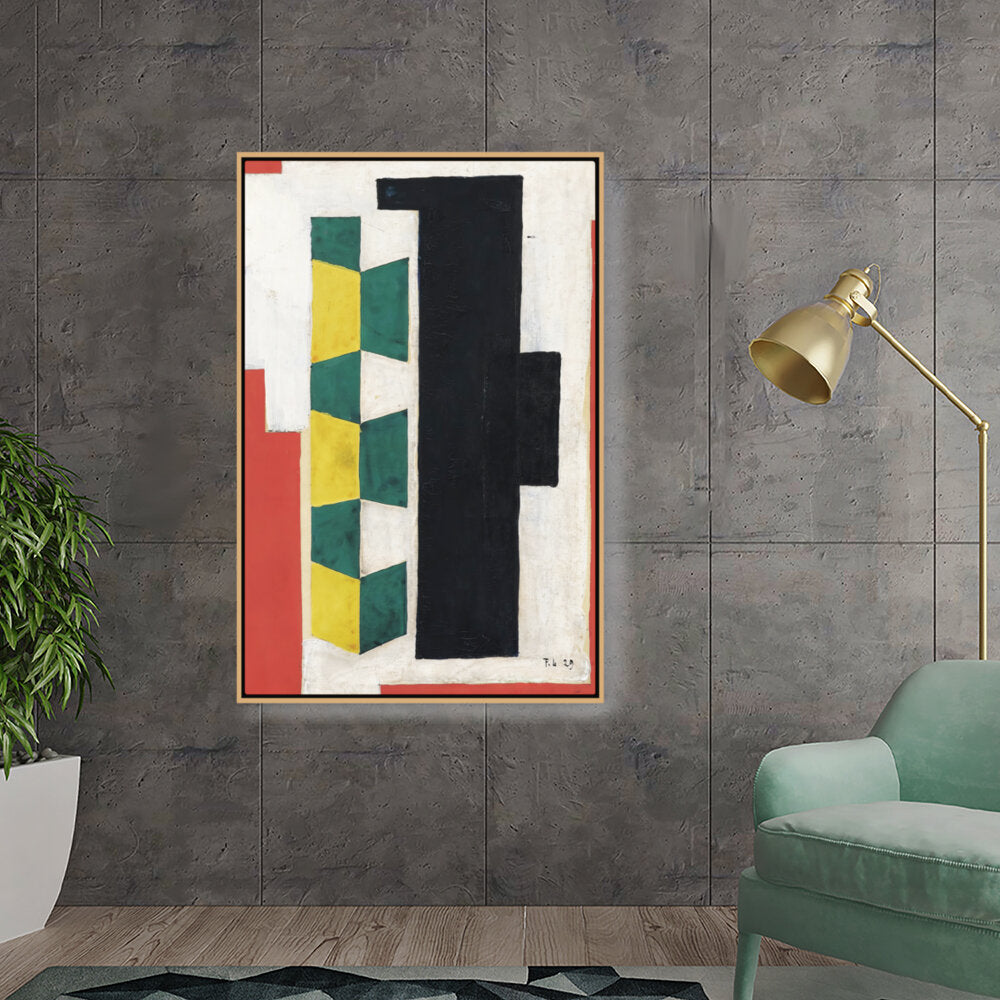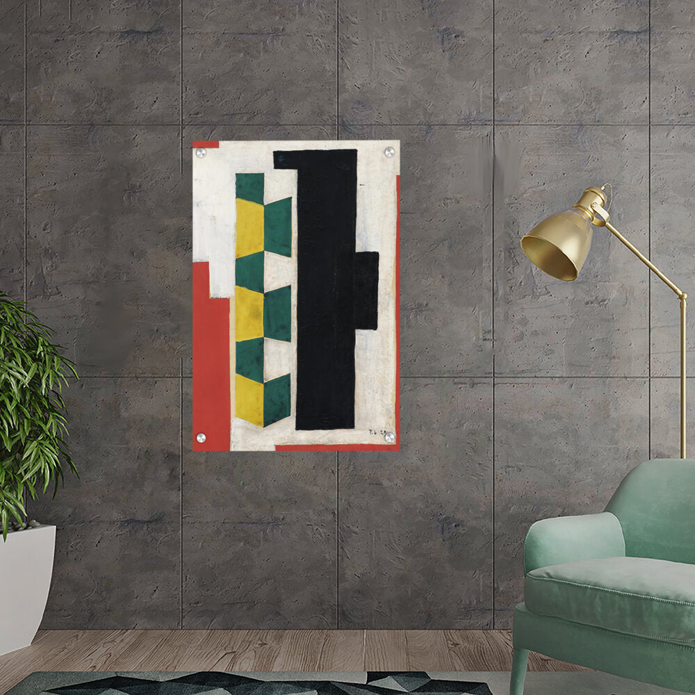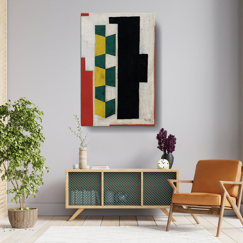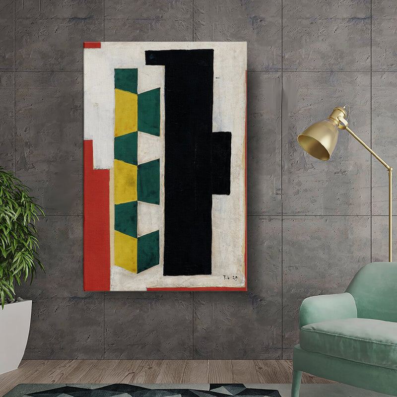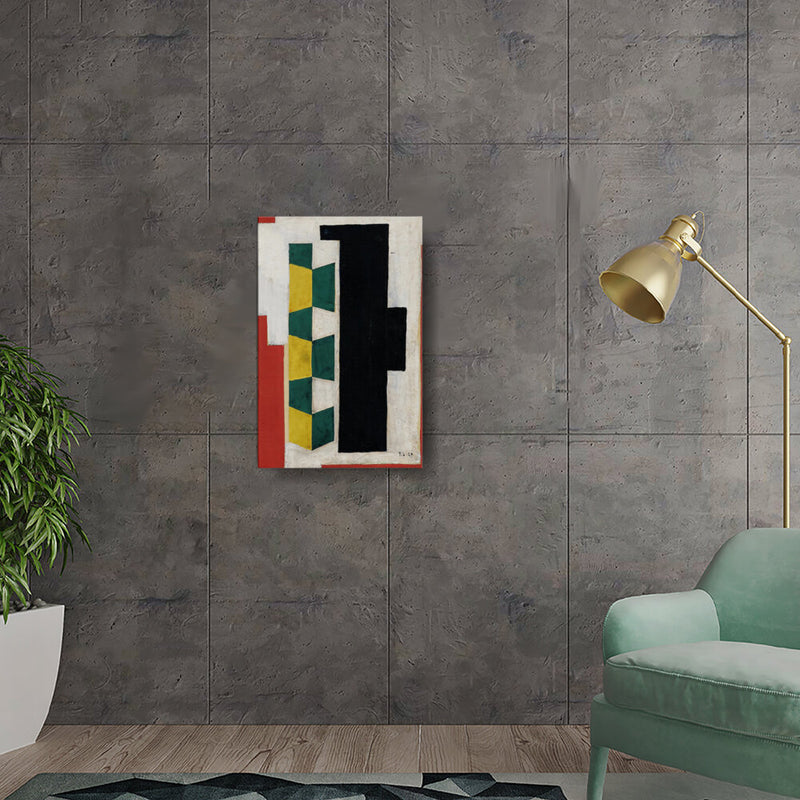 This artwork features a vibrant arrangement of geometric shapes in striking colors including green, yellow, black, and red. The bold forms and textures create a dynamic visual experience that can enhance the atmosphere of any modern space.