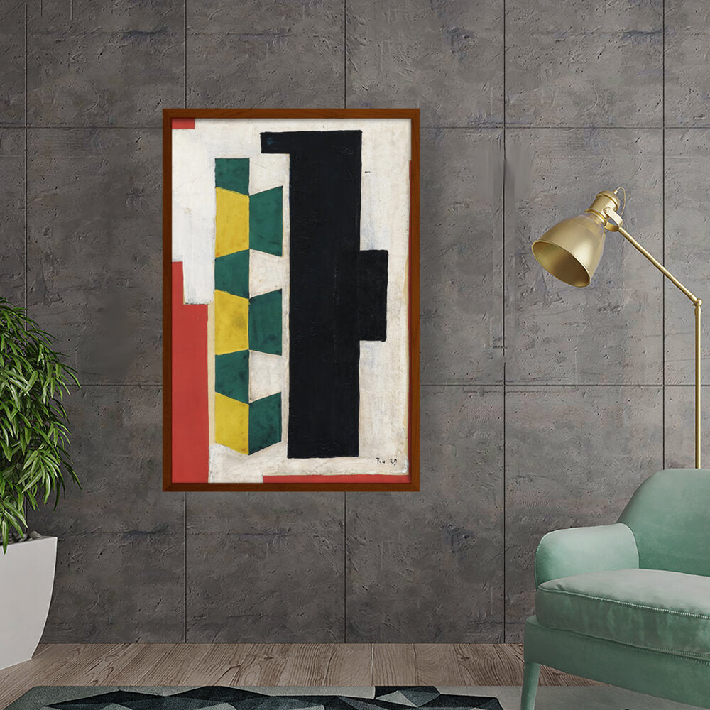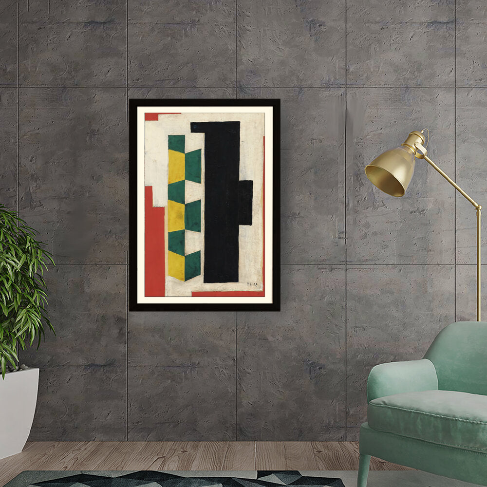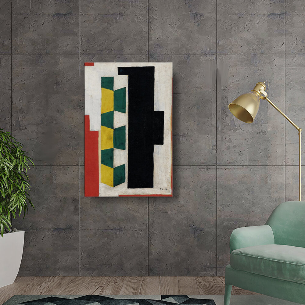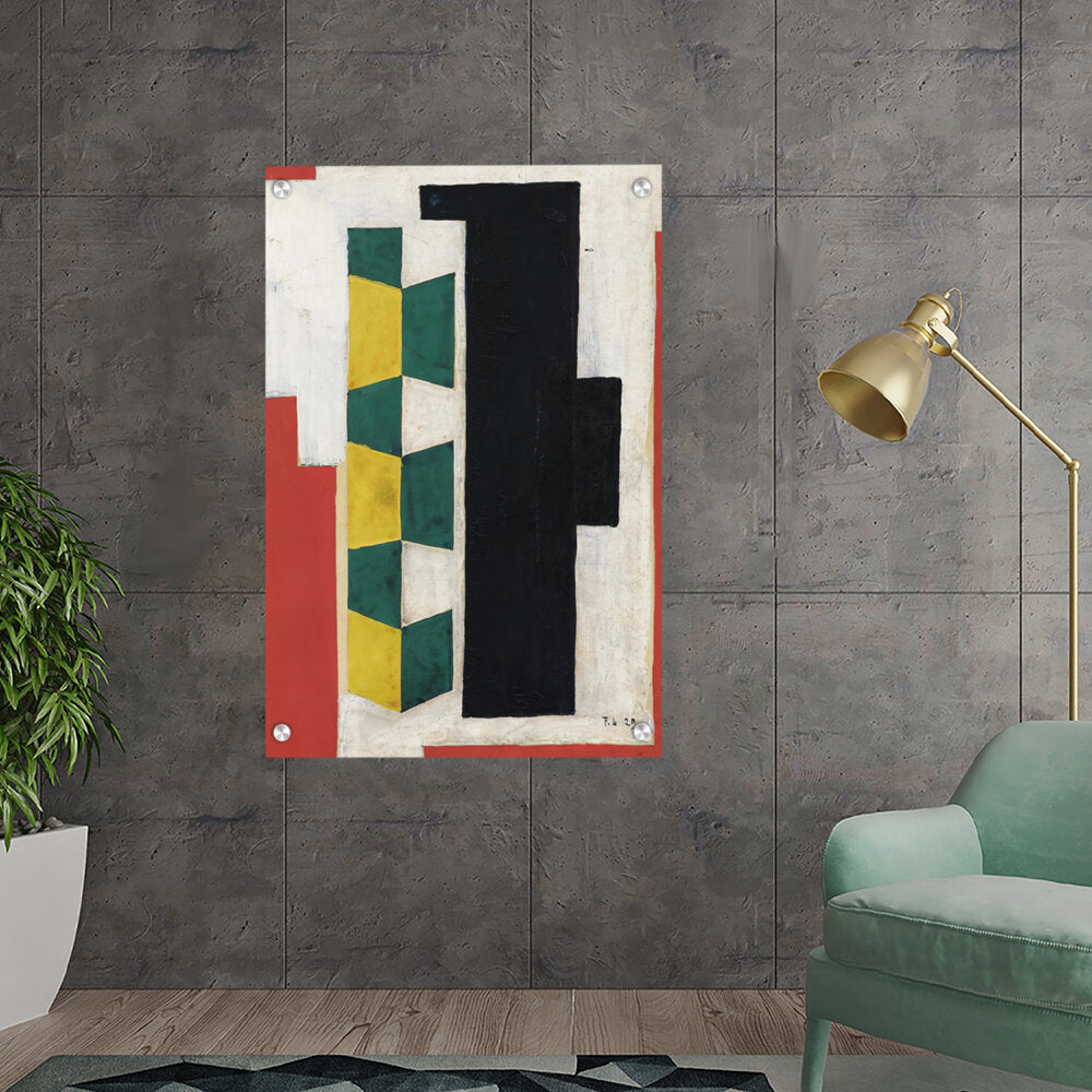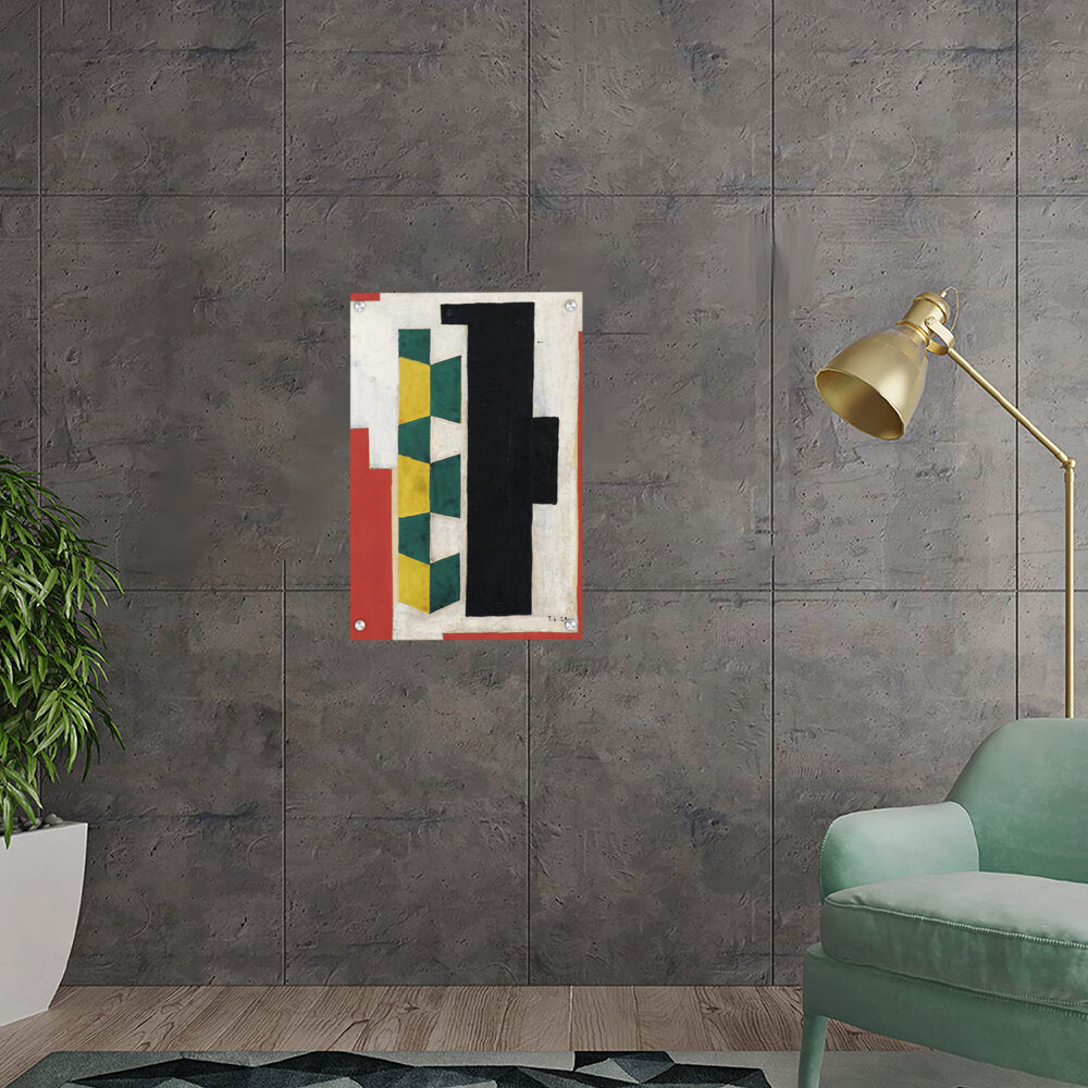 This artwork features a vibrant arrangement of geometric shapes in striking colors including green, yellow, black, and red. The bold forms and textures create a dynamic visual experience that can enhance the atmosphere of any modern space.