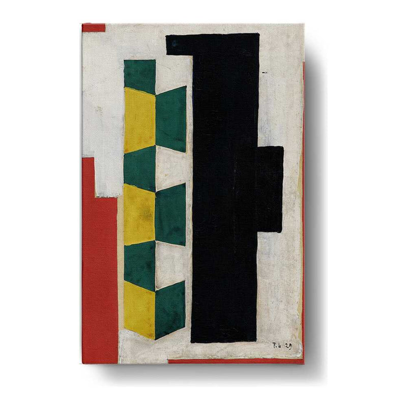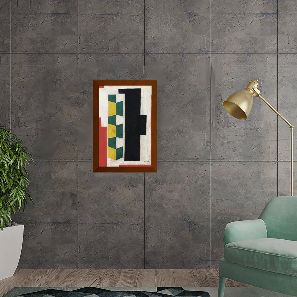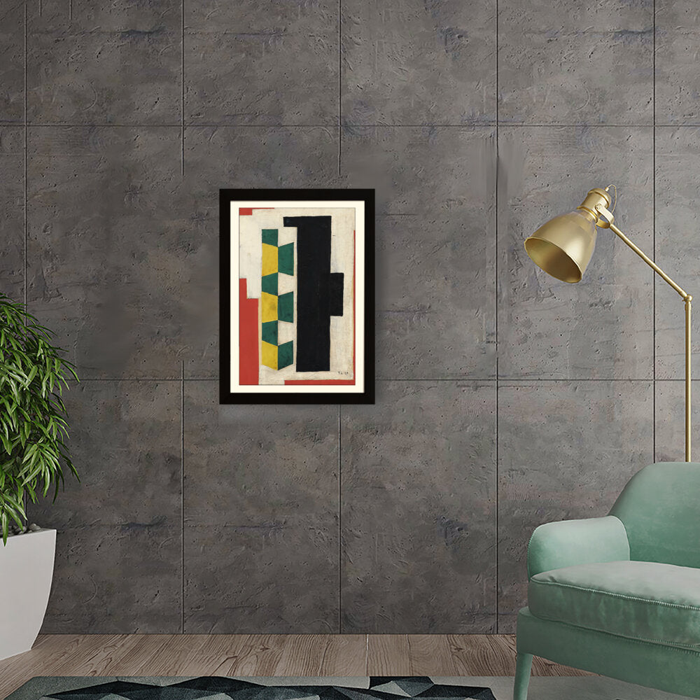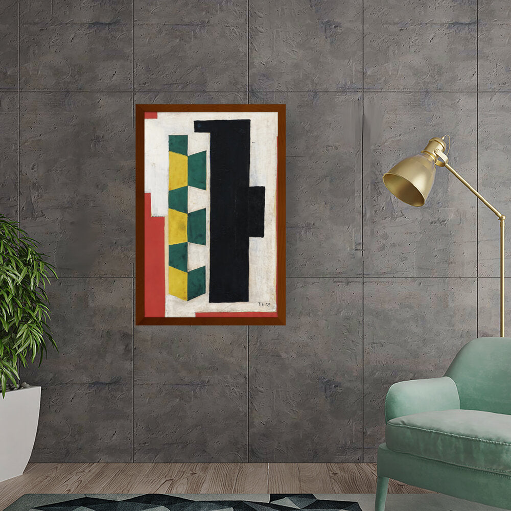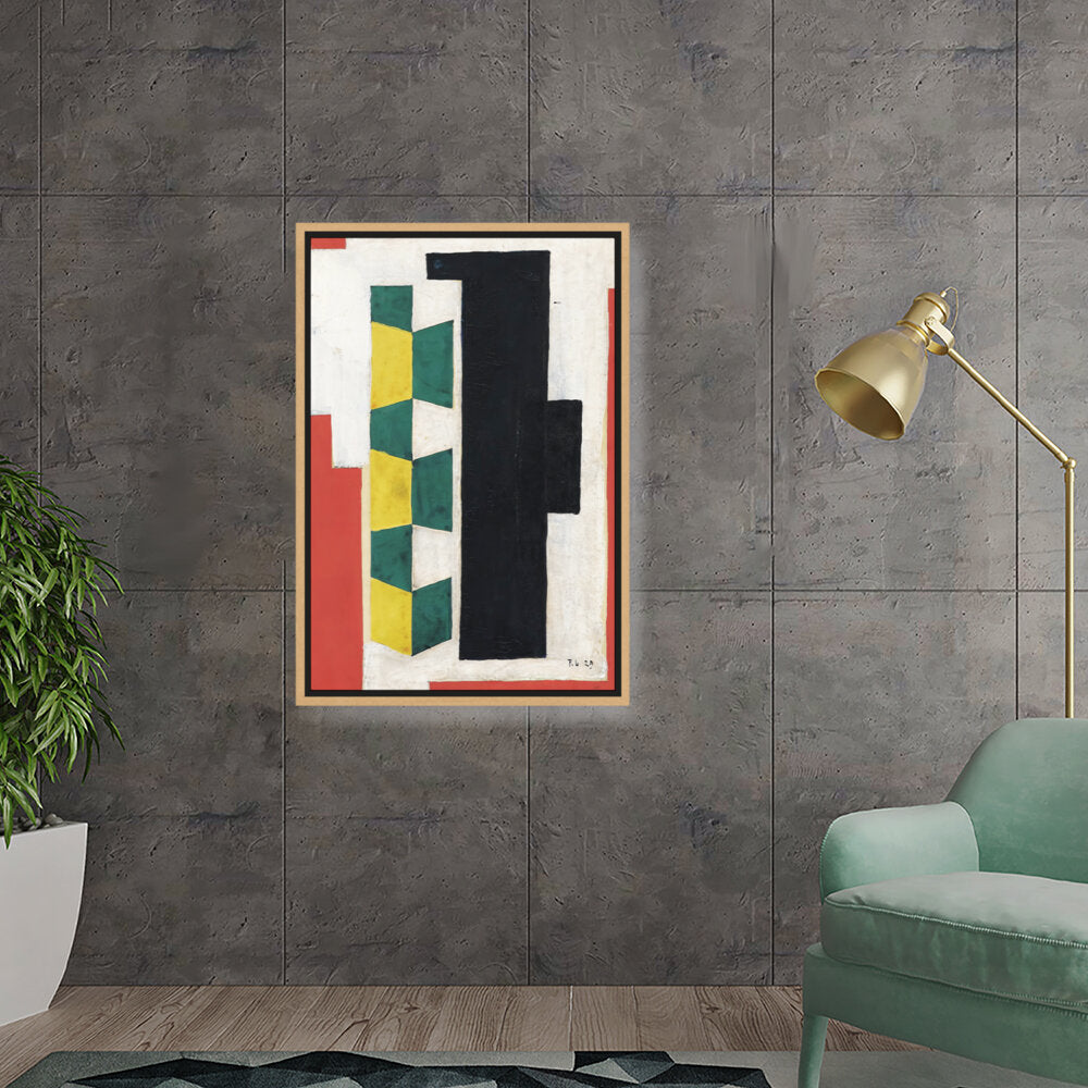 This artwork features a vibrant arrangement of geometric shapes in striking colors including green, yellow, black, and red. The bold forms and textures create a dynamic visual experience that can enhance the atmosphere of any modern space.