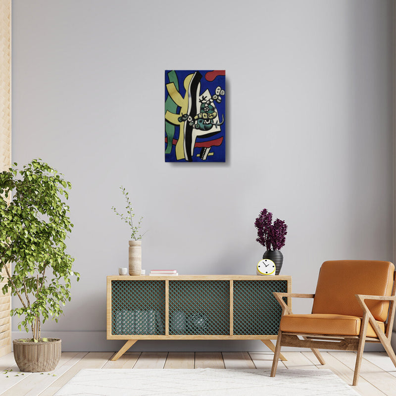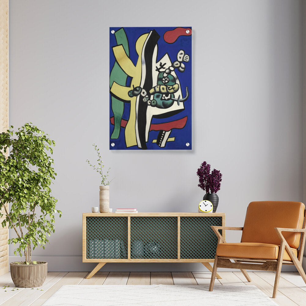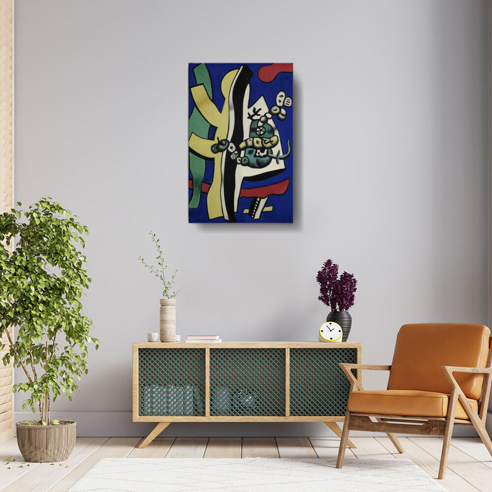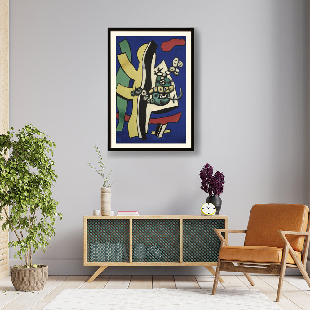 This vibrant abstract composition features bold shapes and colors, creating a dynamic visual experience. The interplay of forms and hues invites viewers to explore their interpretation of the piece, making it a perfect addition to any creative space.