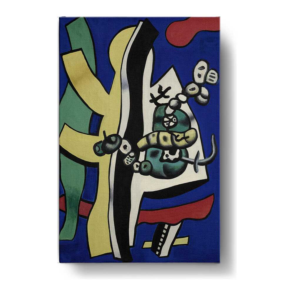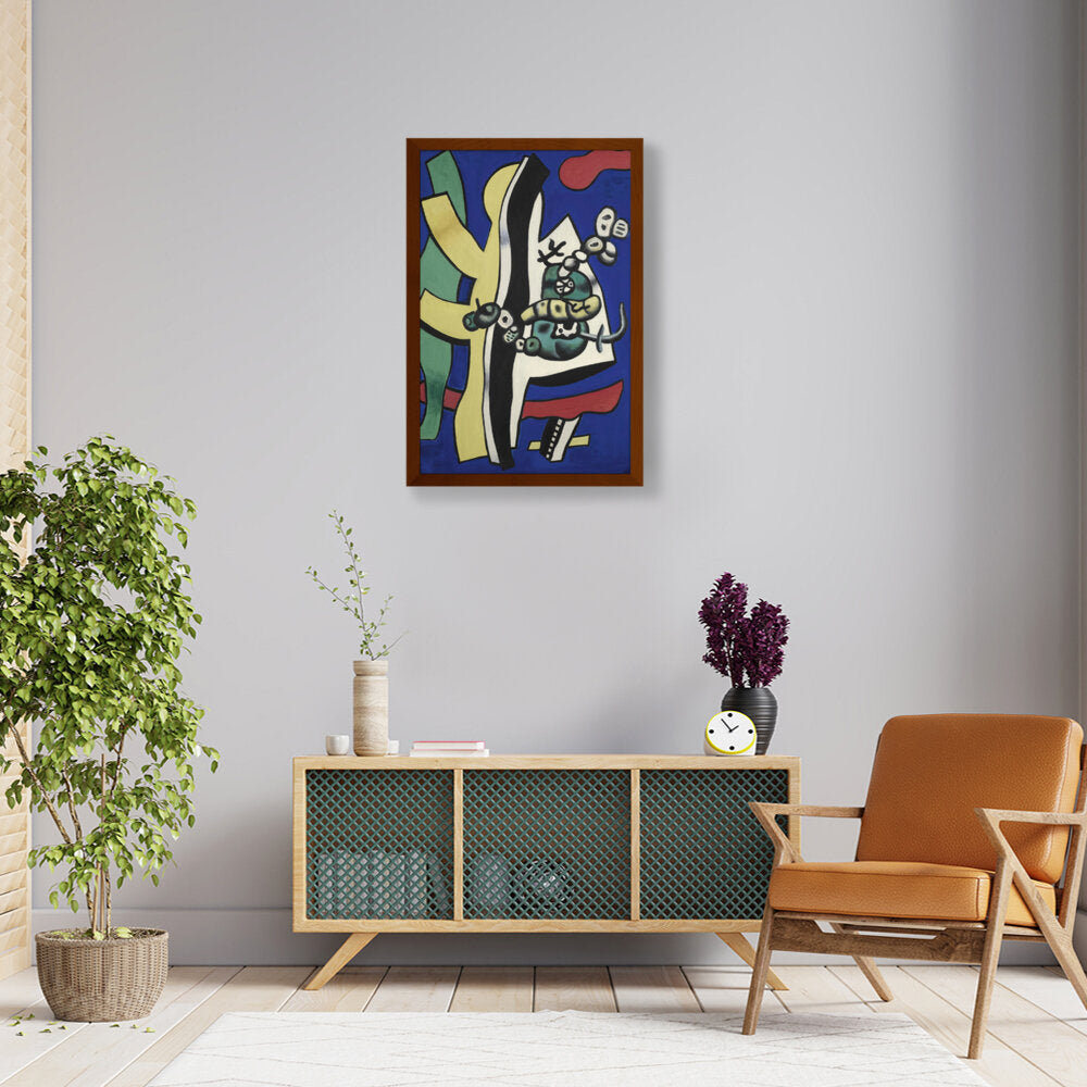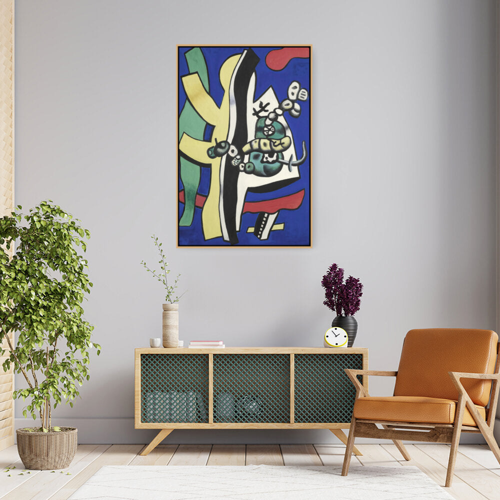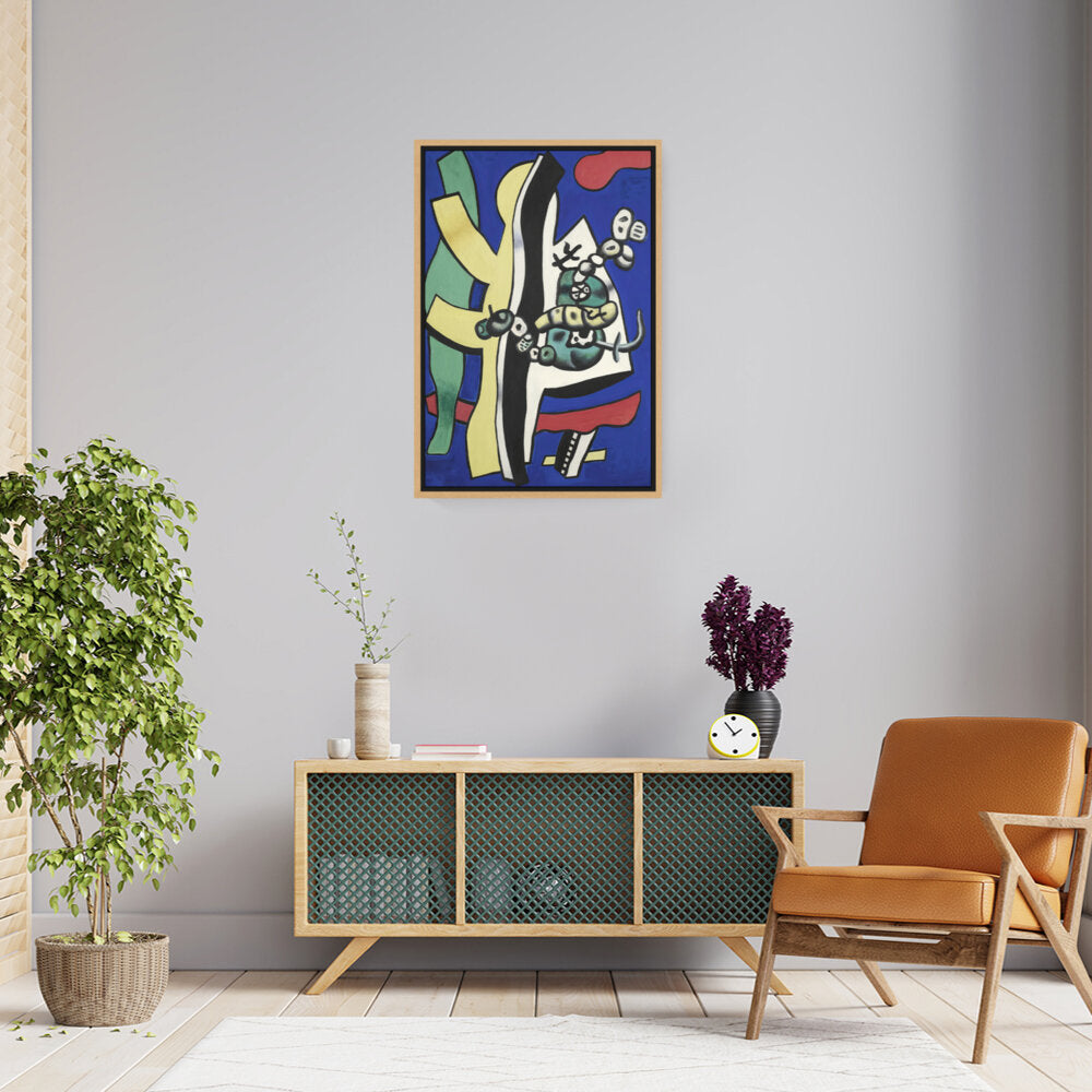 This vibrant abstract composition features bold shapes and colors, creating a dynamic visual experience. The interplay of forms and hues invites viewers to explore their interpretation of the piece, making it a perfect addition to any creative space.