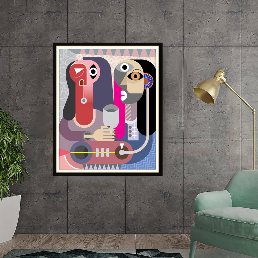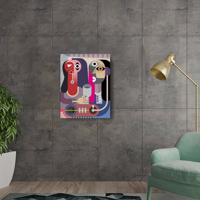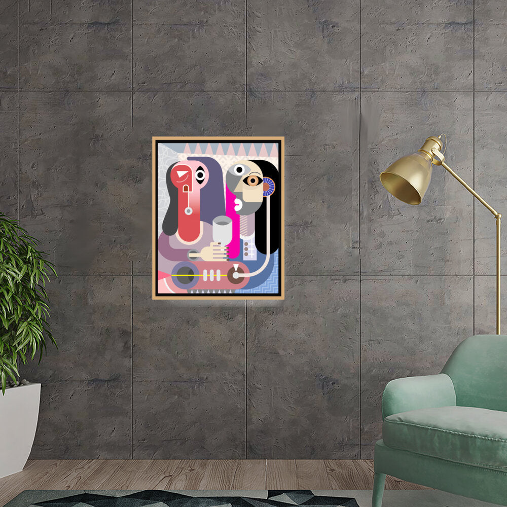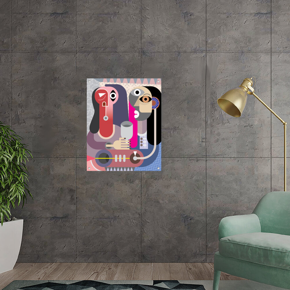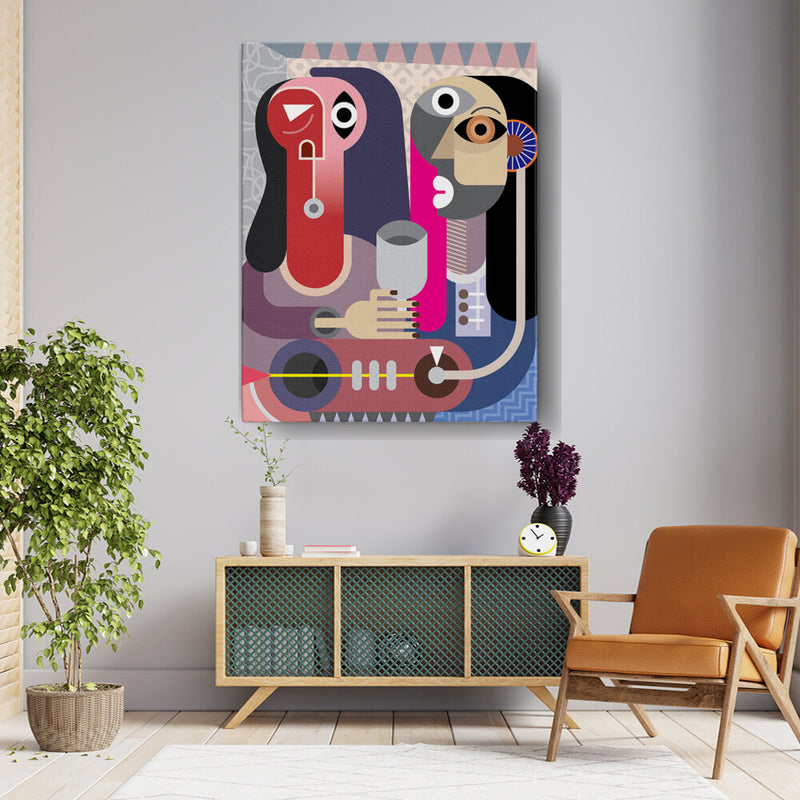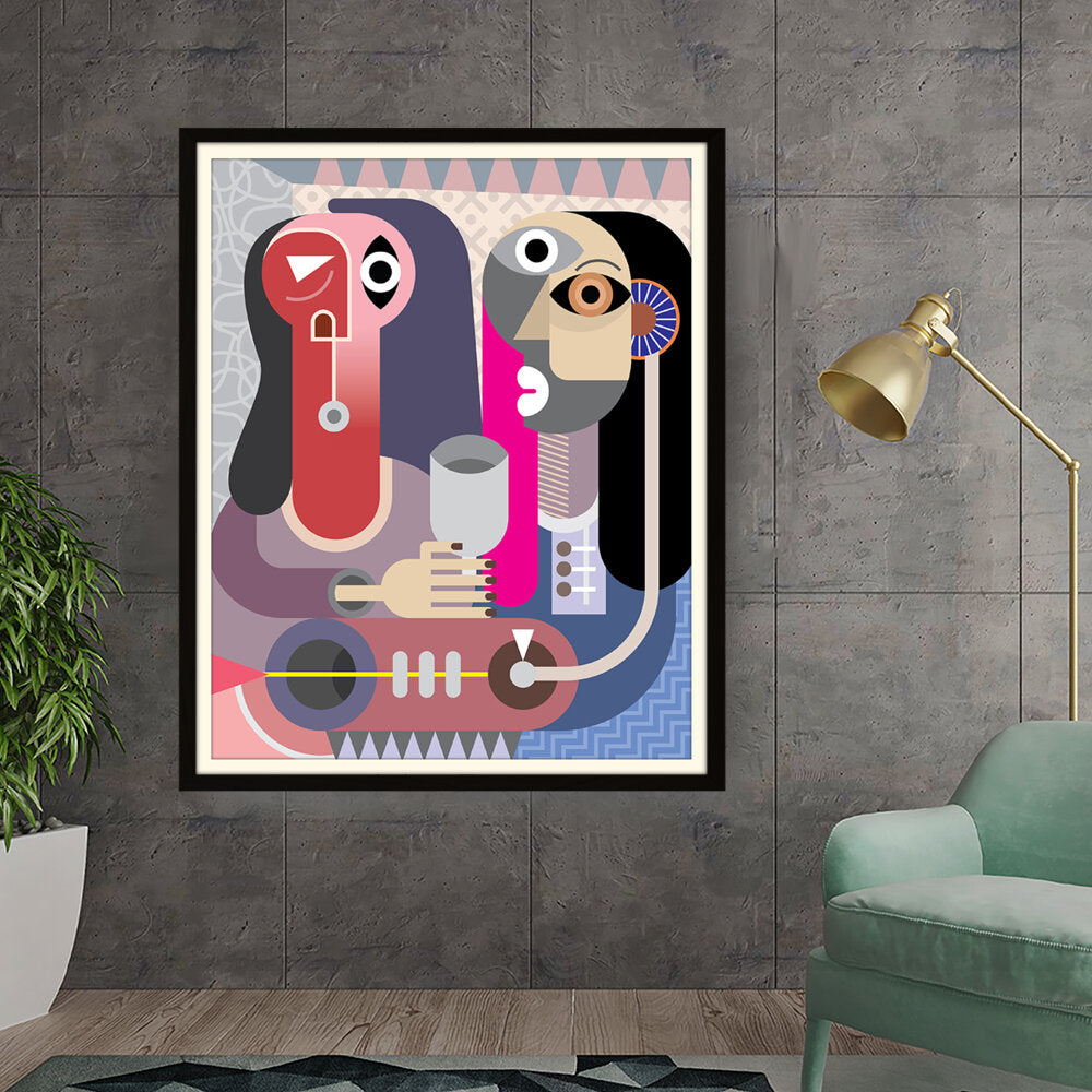 This vibrant digital artwork features two abstract figures interacting in a harmonious composition. The bold shapes and colors create a dynamic visual experience, making it a perfect conversation starter for any modern space.