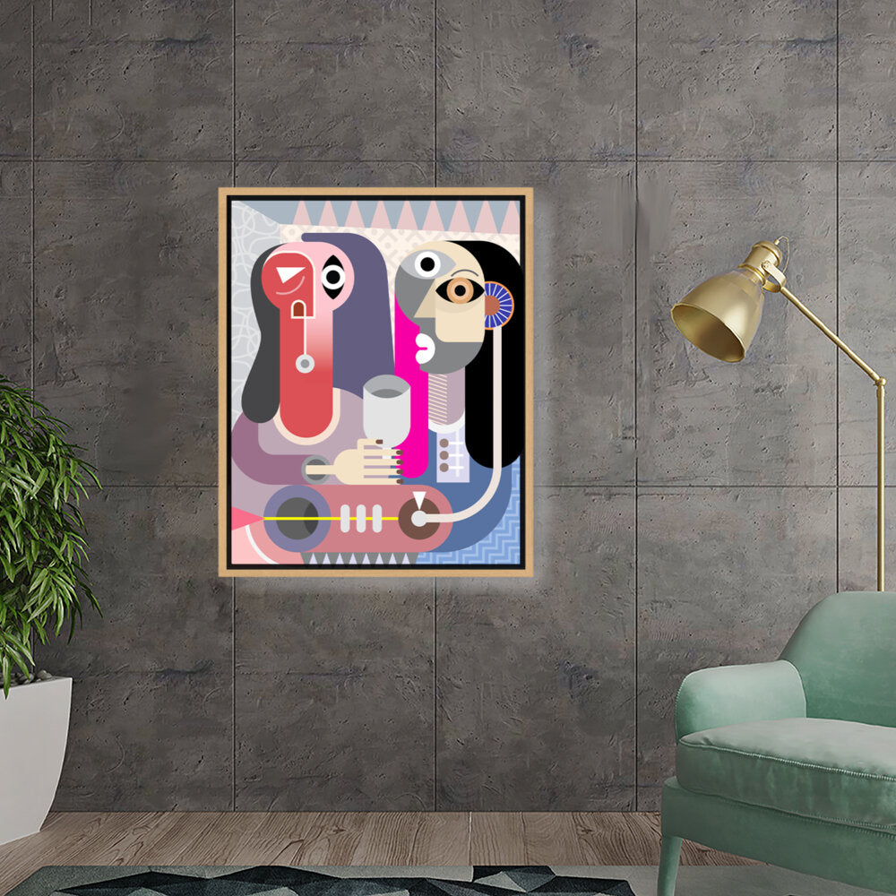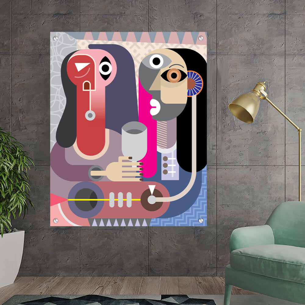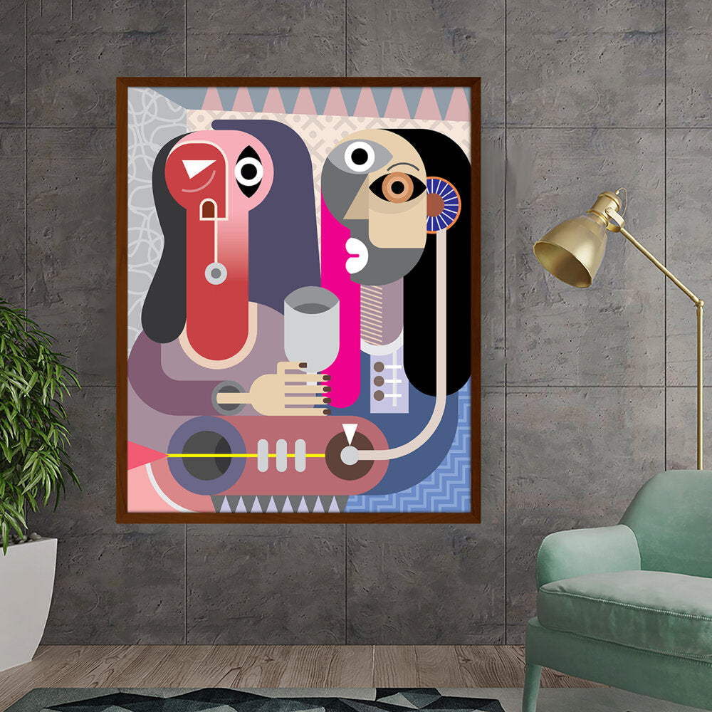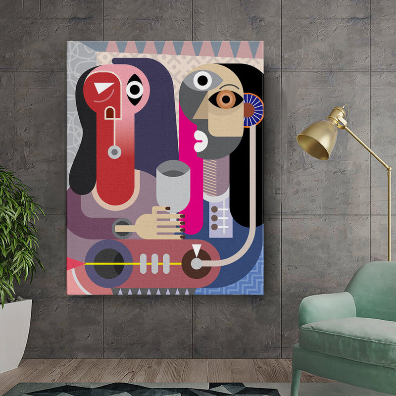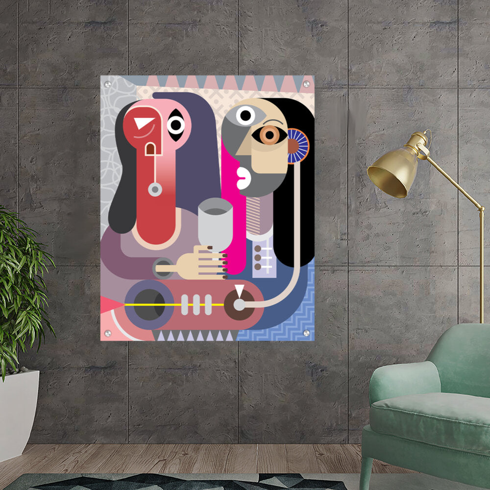 This vibrant digital artwork features two abstract figures interacting in a harmonious composition. The bold shapes and colors create a dynamic visual experience, making it a perfect conversation starter for any modern space.