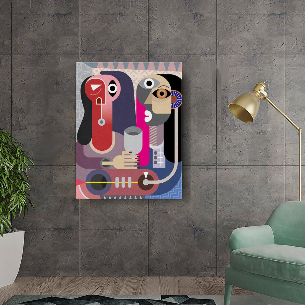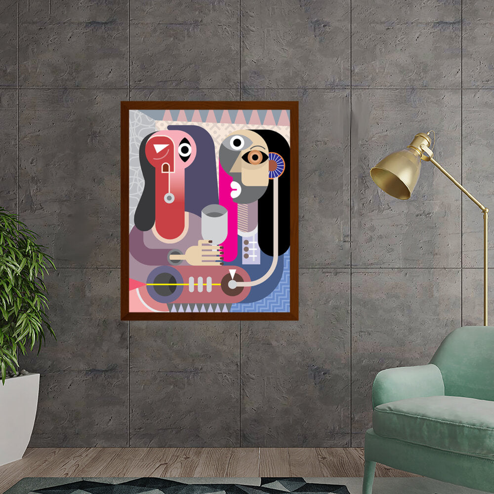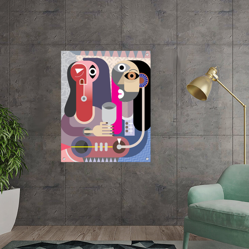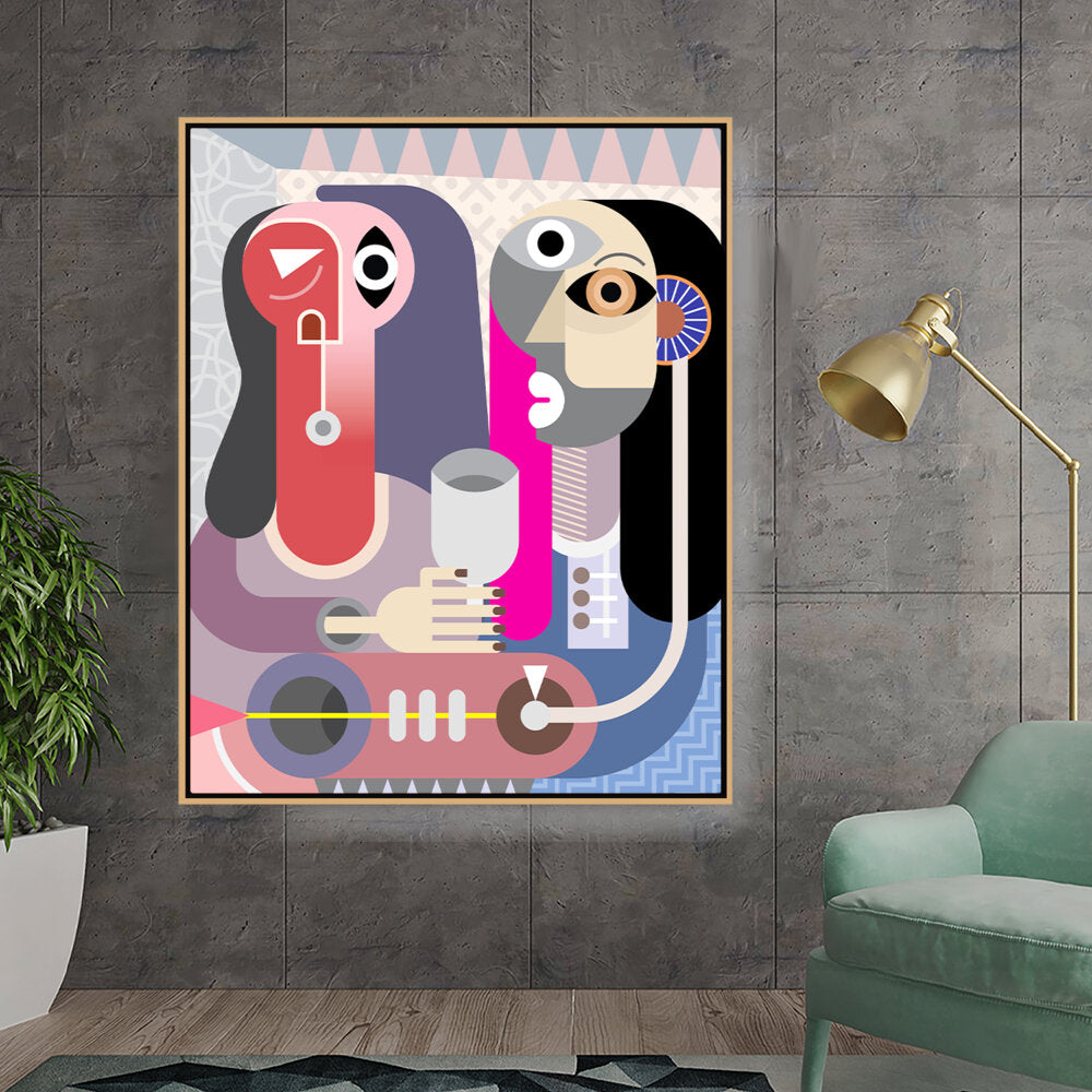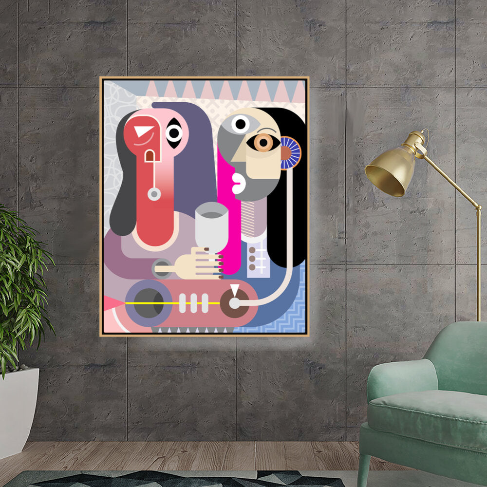 This vibrant digital artwork features two abstract figures interacting in a harmonious composition. The bold shapes and colors create a dynamic visual experience, making it a perfect conversation starter for any modern space.