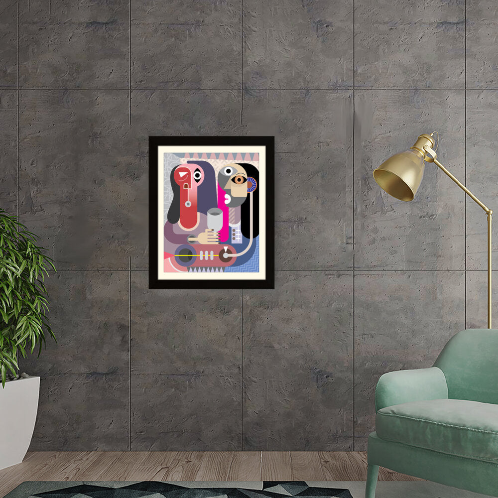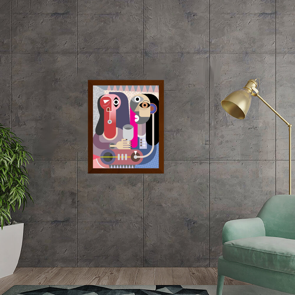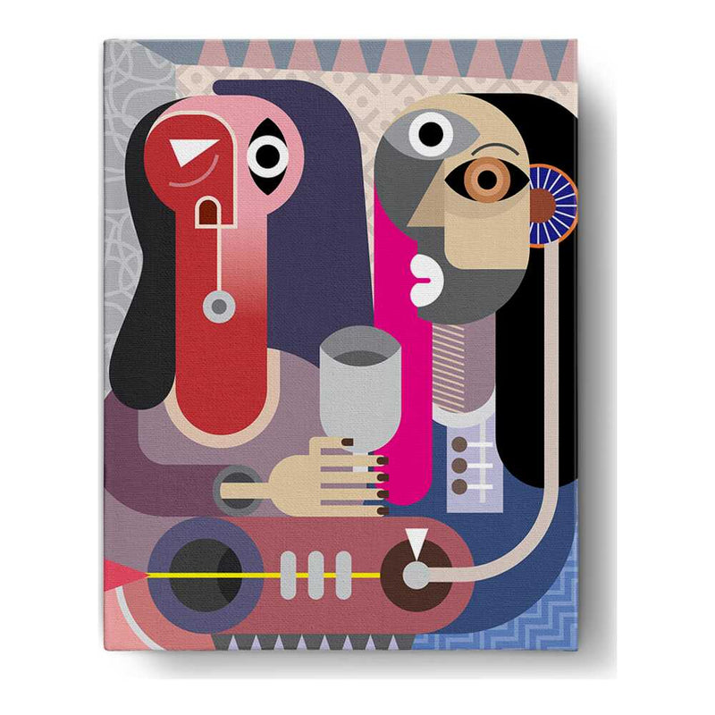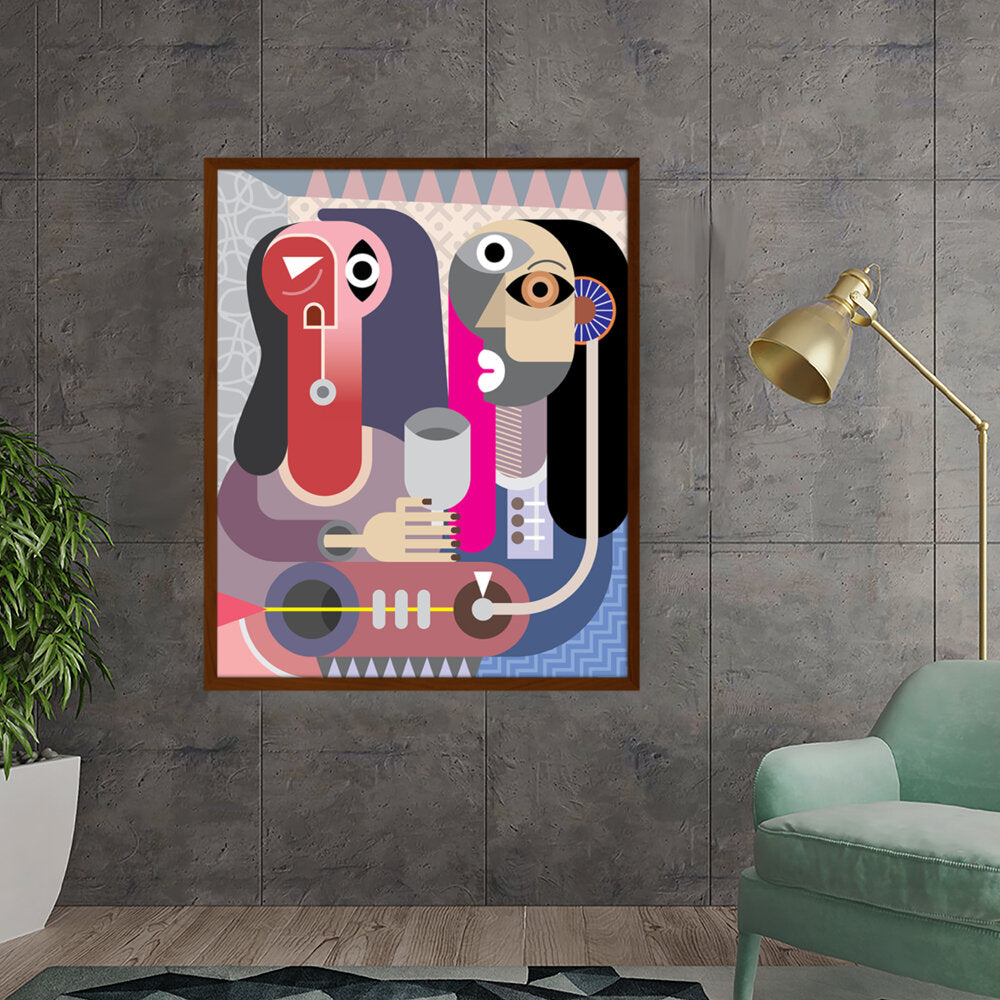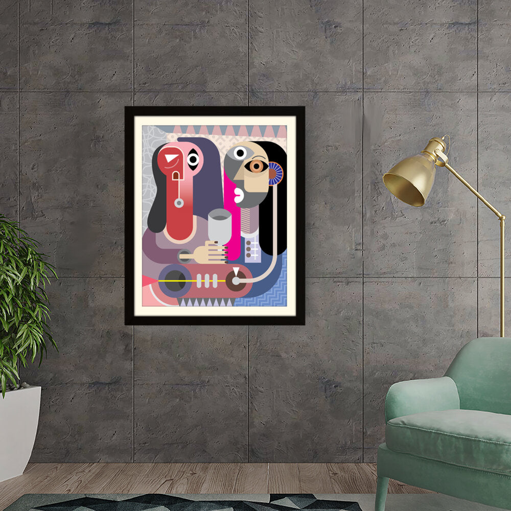 This vibrant digital artwork features two abstract figures interacting in a harmonious composition. The bold shapes and colors create a dynamic visual experience, making it a perfect conversation starter for any modern space.