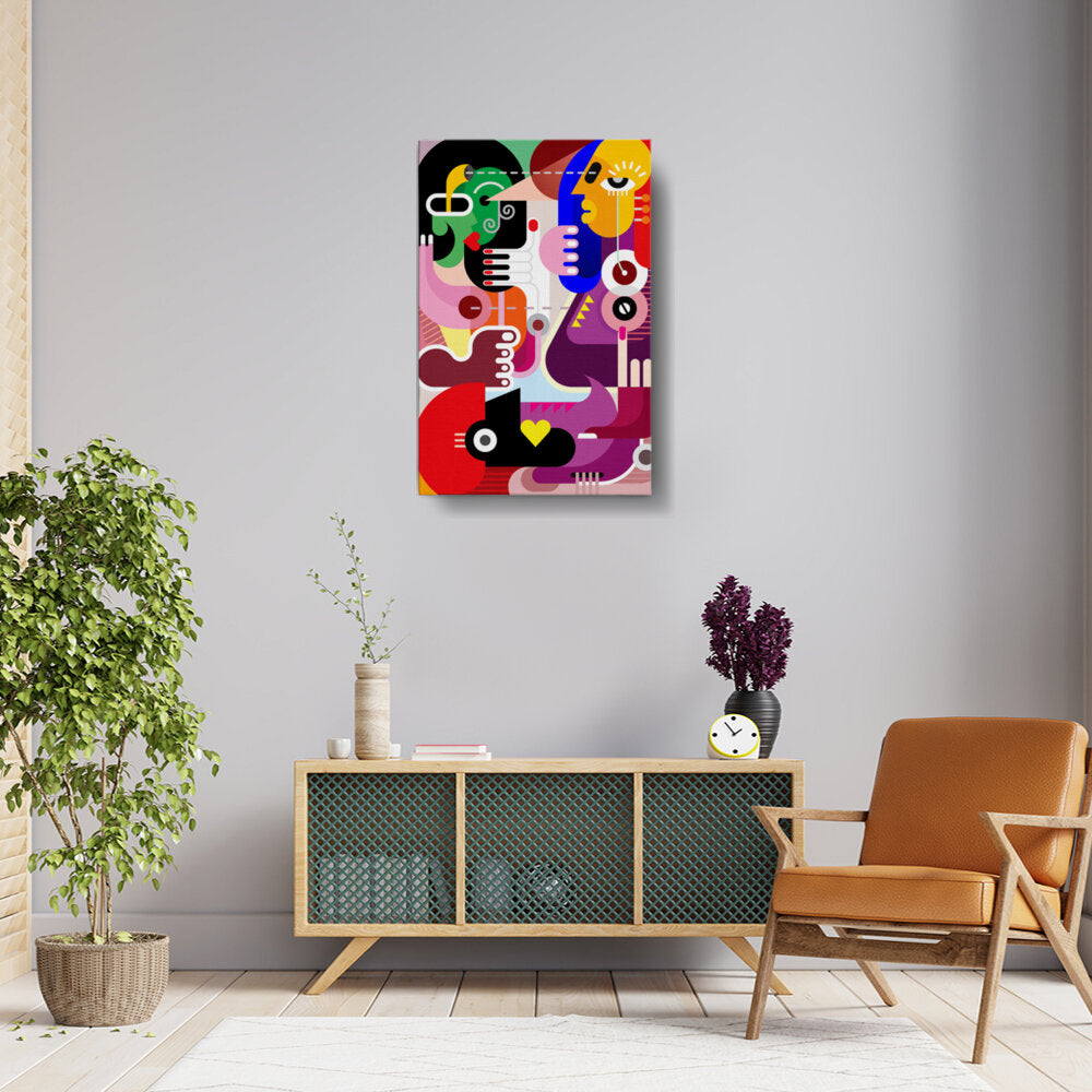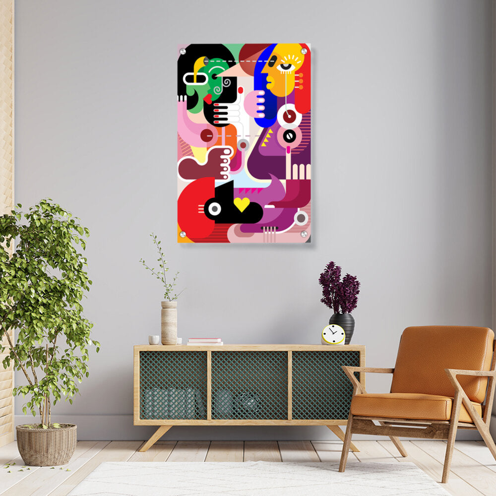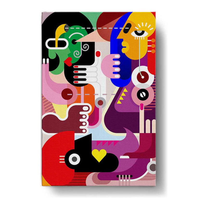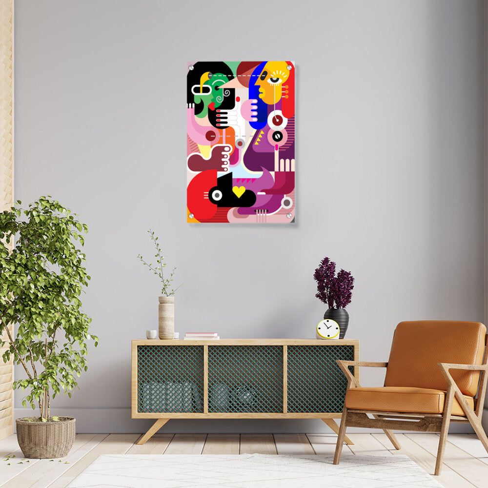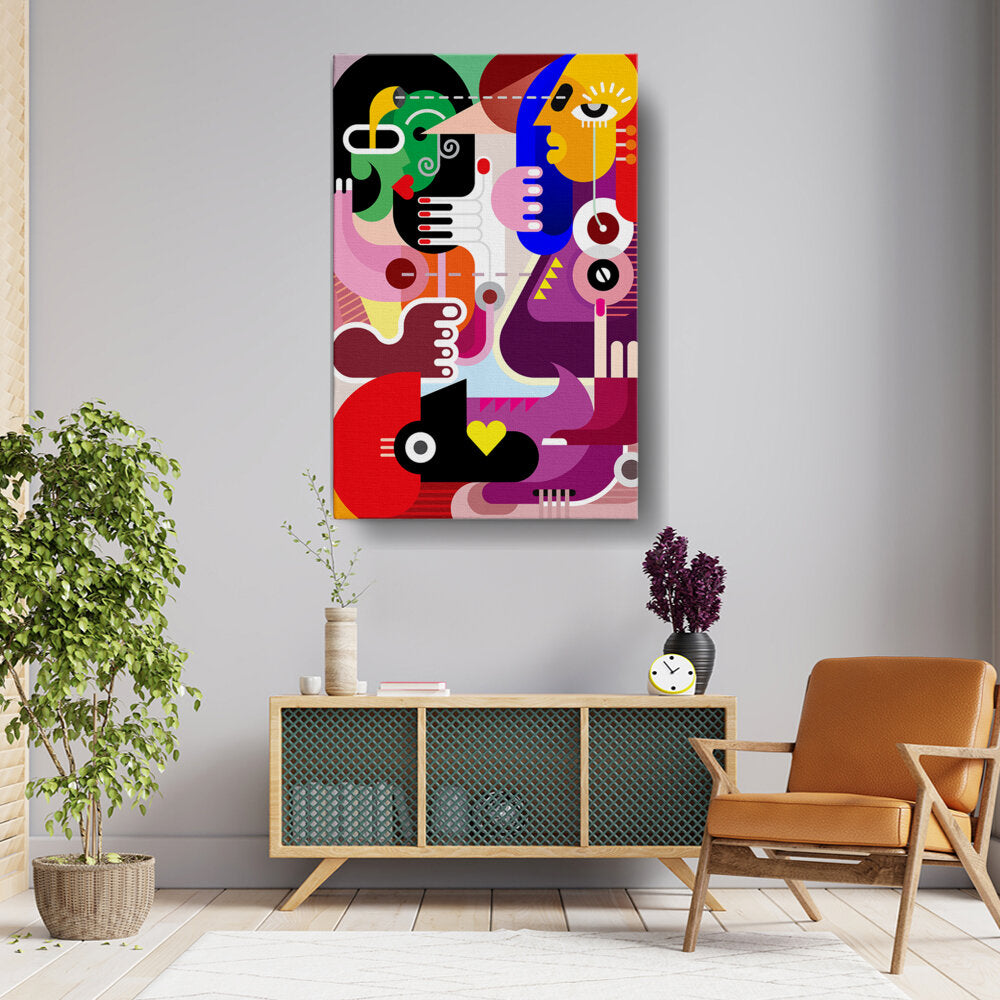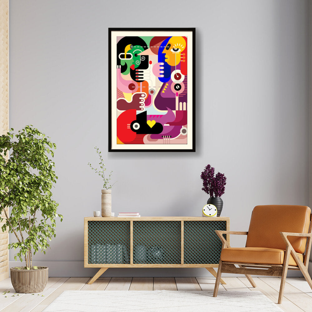 This vibrant digital artwork features abstract representations of human figures intertwined in a colorful composition. The interplay of shapes and vivid colors invites viewers to explore themes of connection and emotion within a modern context.