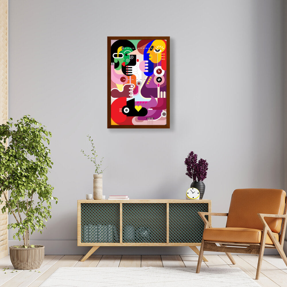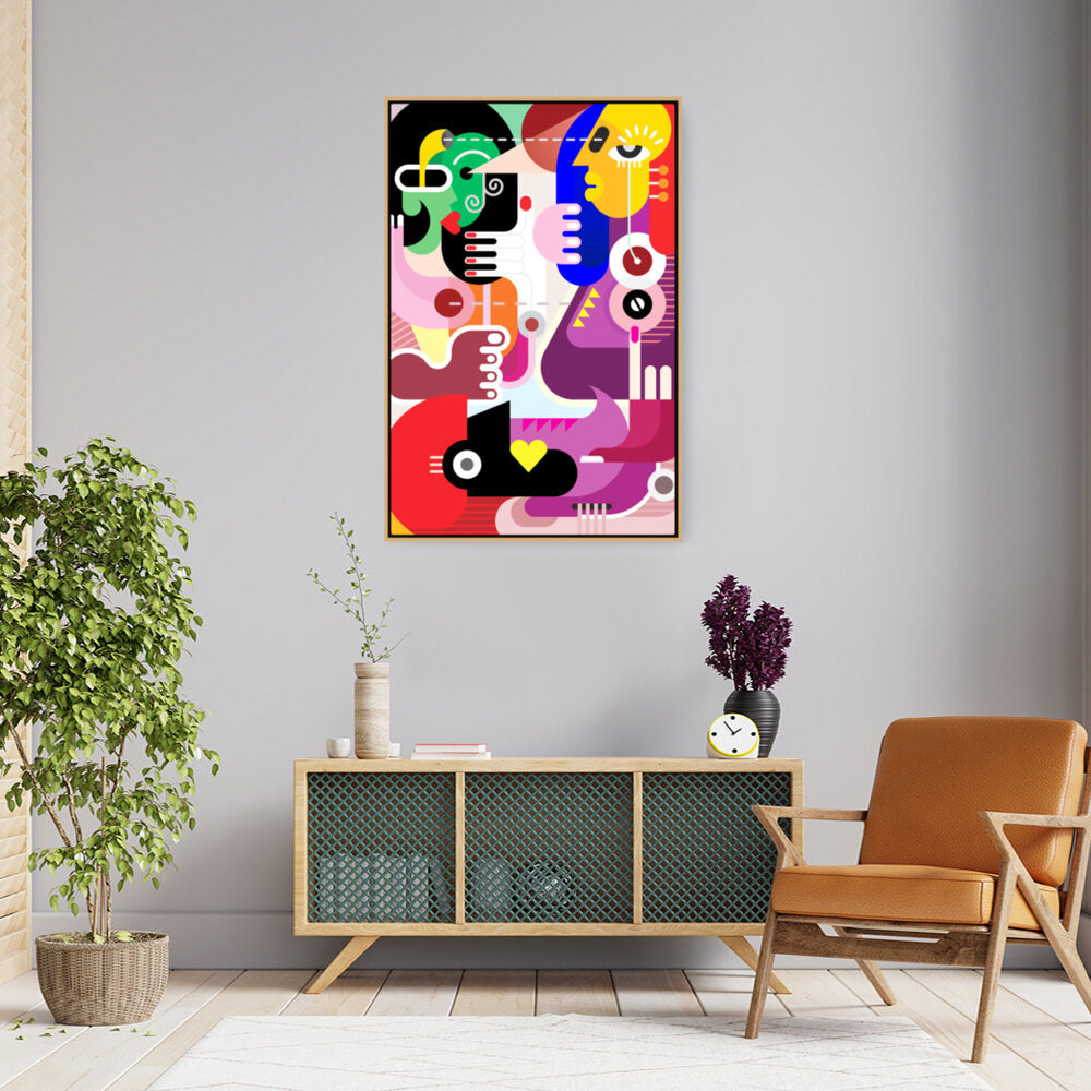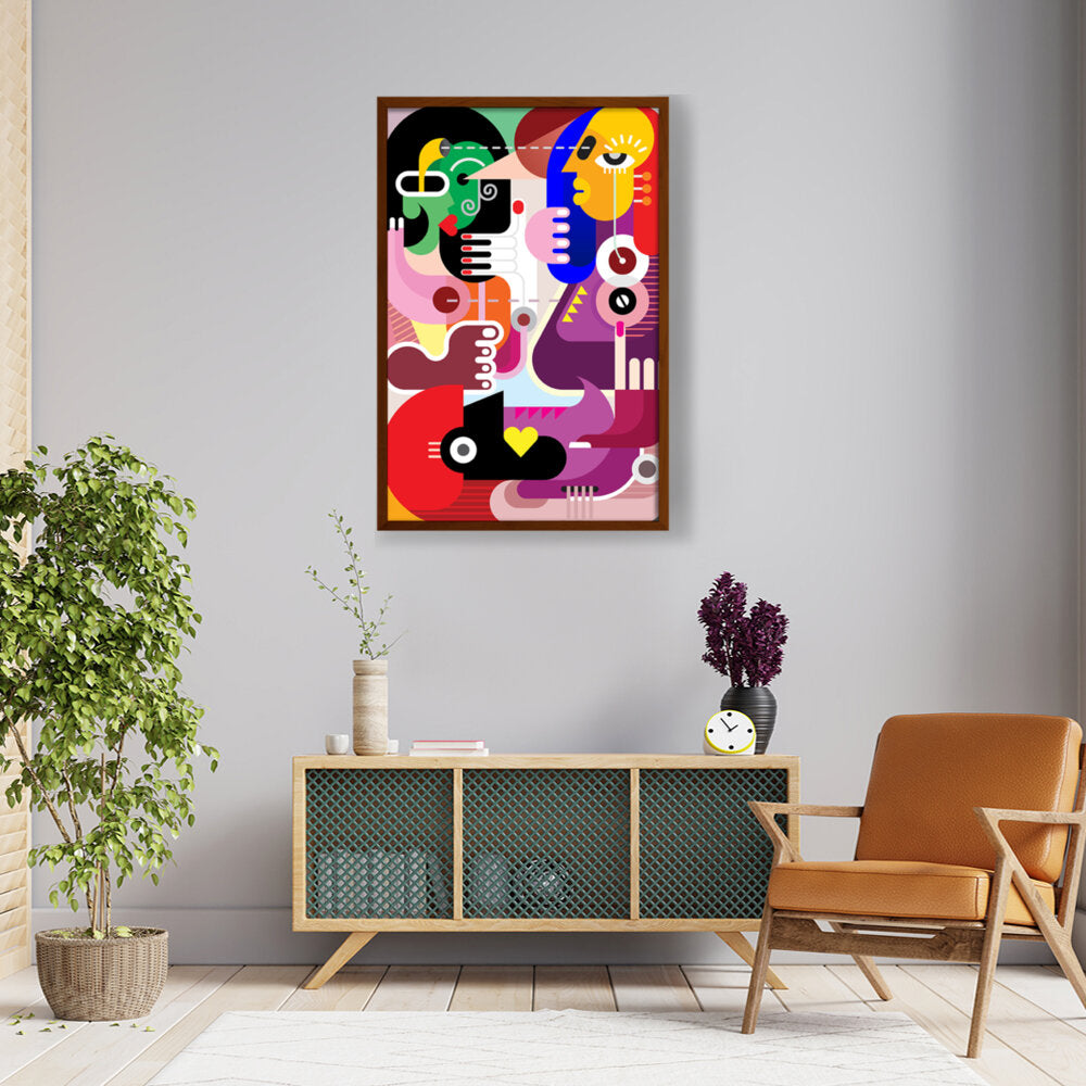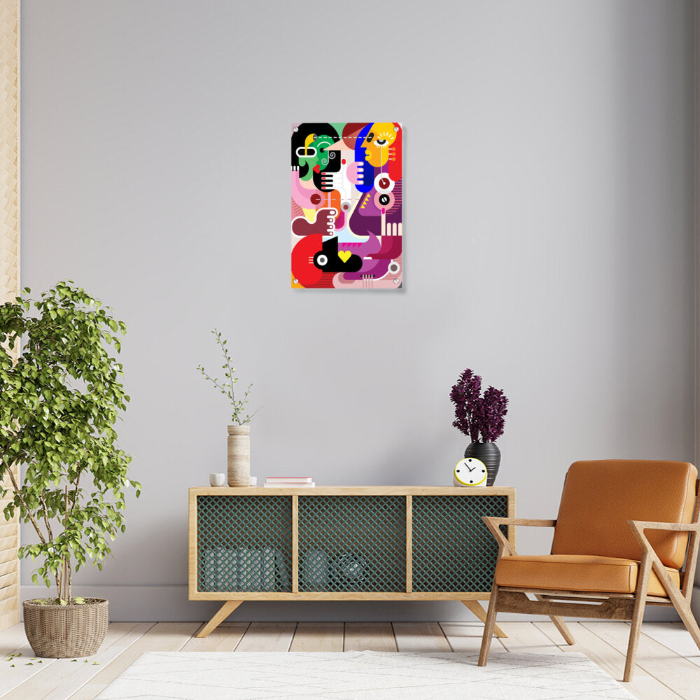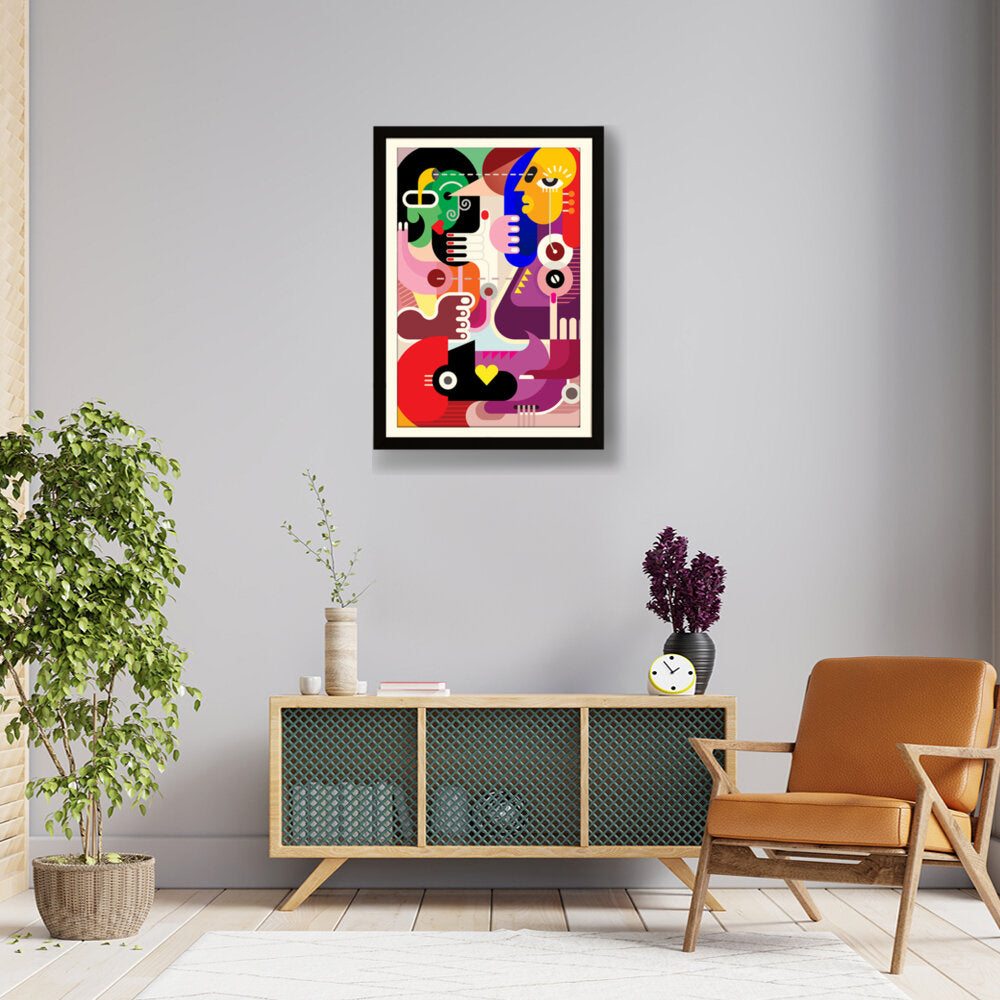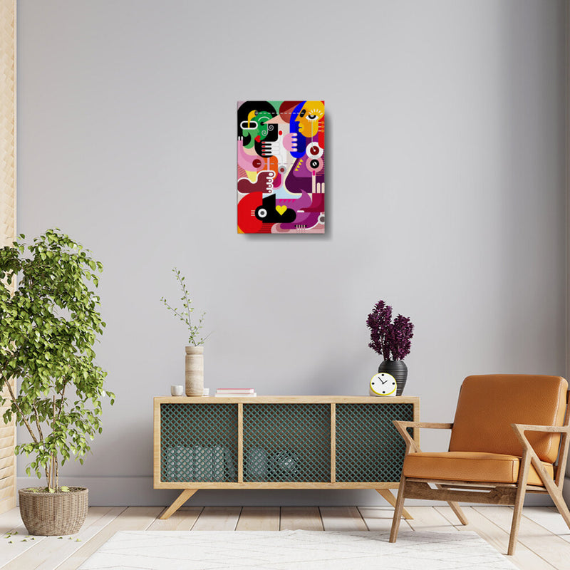 This vibrant digital artwork features abstract representations of human figures intertwined in a colorful composition. The interplay of shapes and vivid colors invites viewers to explore themes of connection and emotion within a modern context.