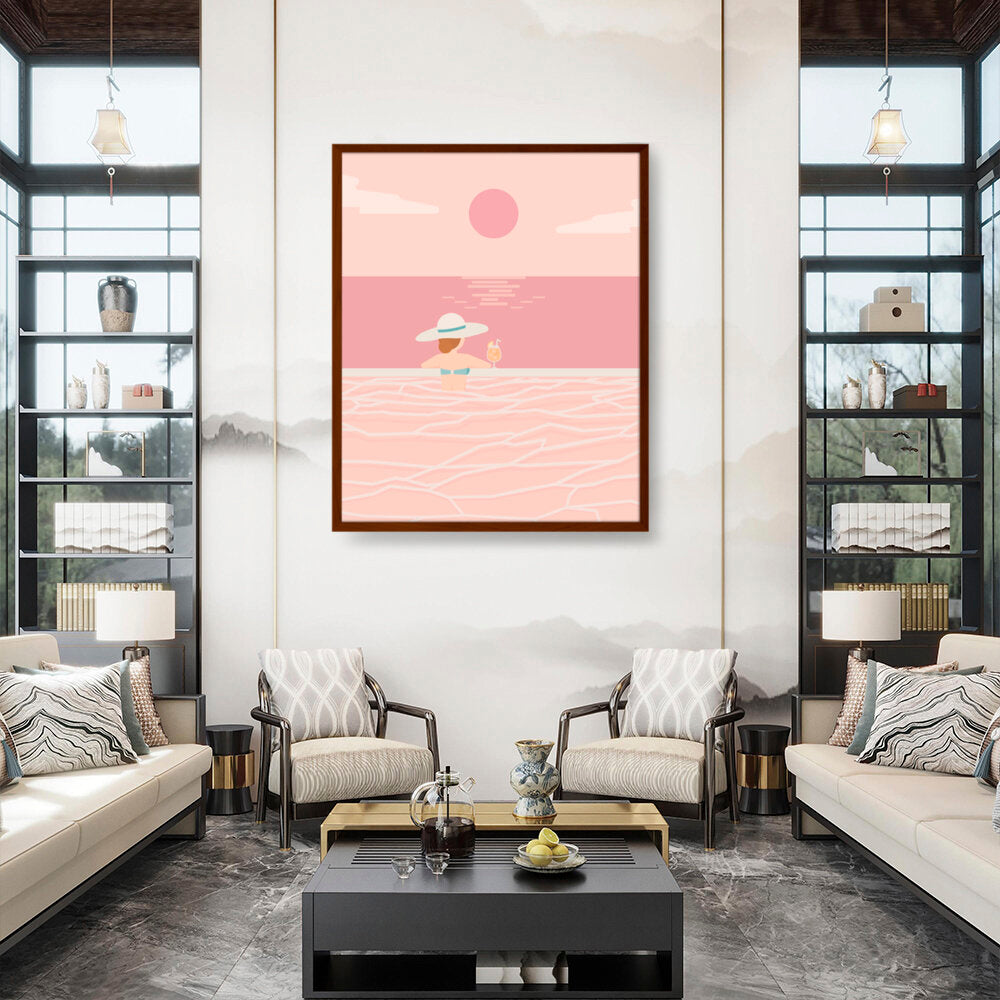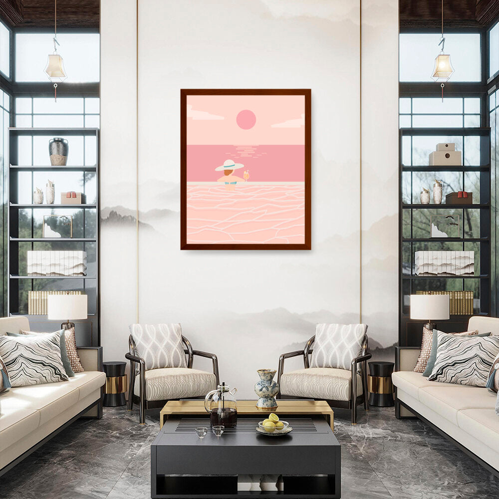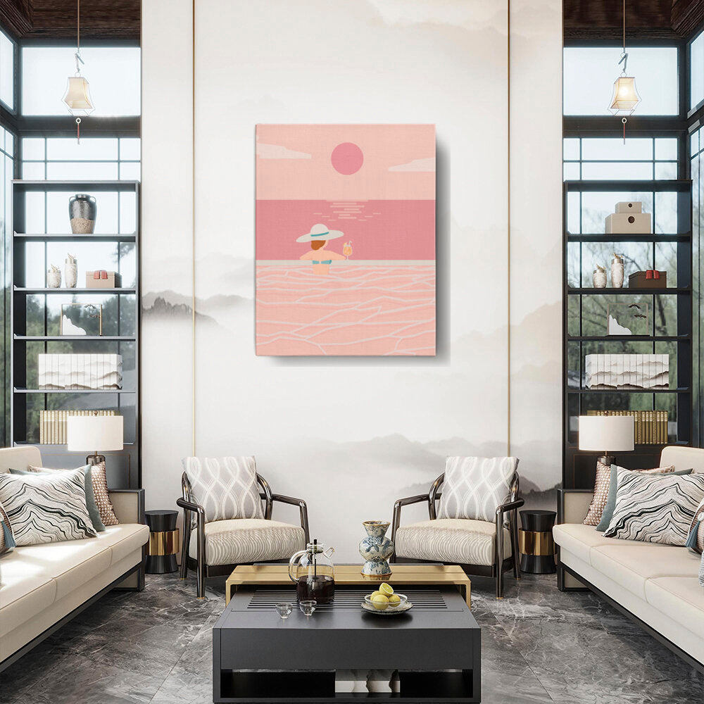 Experience the tranquil vibes of summer with this minimalistic vector art piece. A calm figure enjoys a refreshing drink while soaking in serene waters, perfect for any relaxing space.