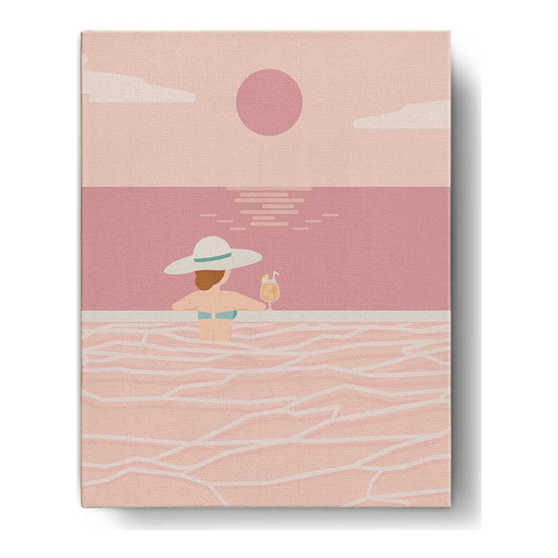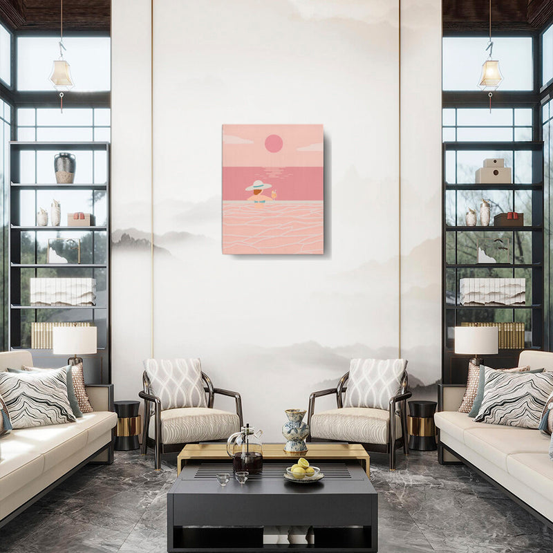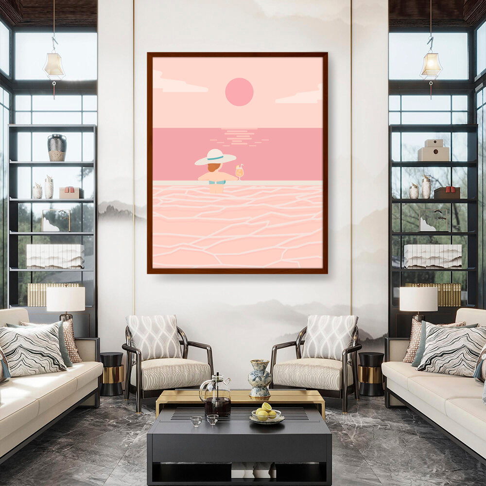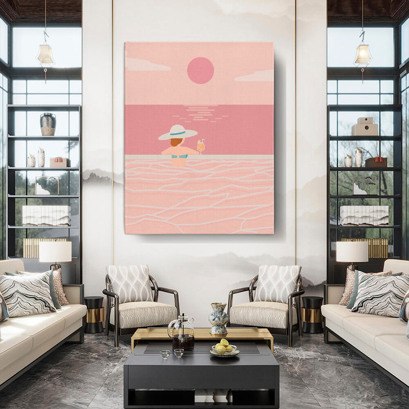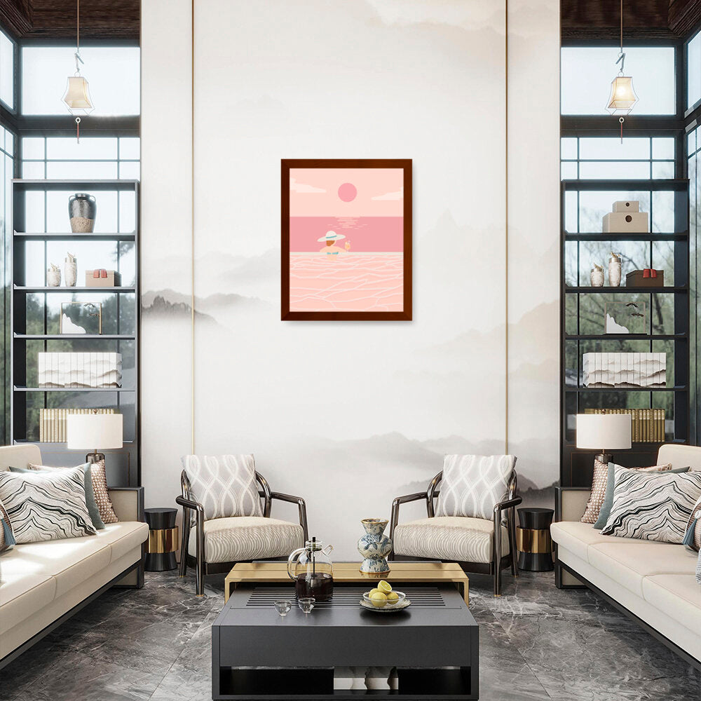 Experience the tranquil vibes of summer with this minimalistic vector art piece. A calm figure enjoys a refreshing drink while soaking in serene waters, perfect for any relaxing space.
